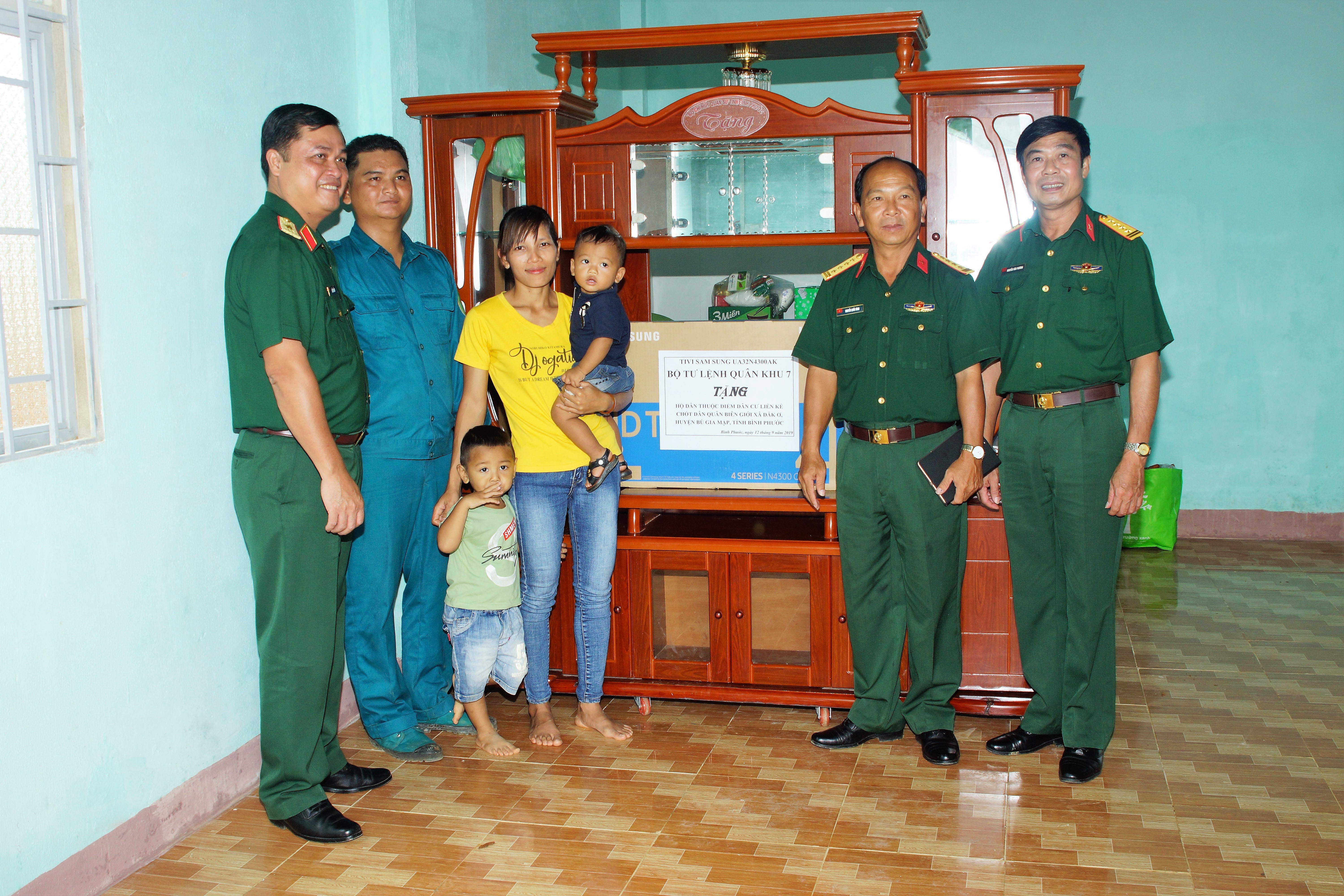 Thủ trưởng Cục Chính trị Quân khu và Bộ CHQS tỉnh tặng quà gia đình dân quân tại điểm dân cư liền kề.