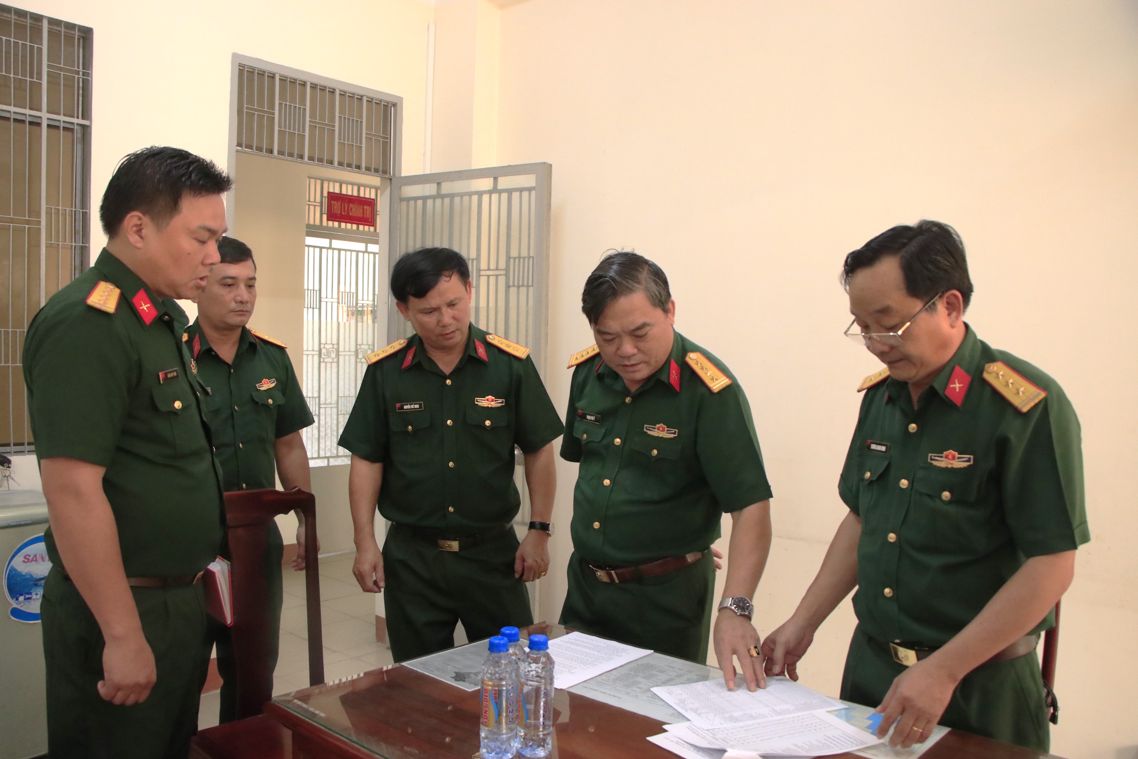Đại tá Phạm Phú Ý (thứ 2 từ phải qua) kiểm tra hệ thống văn kiện công tác tham mưu, tác chiến, xây dựng khu vực phòng thủ địa phương.