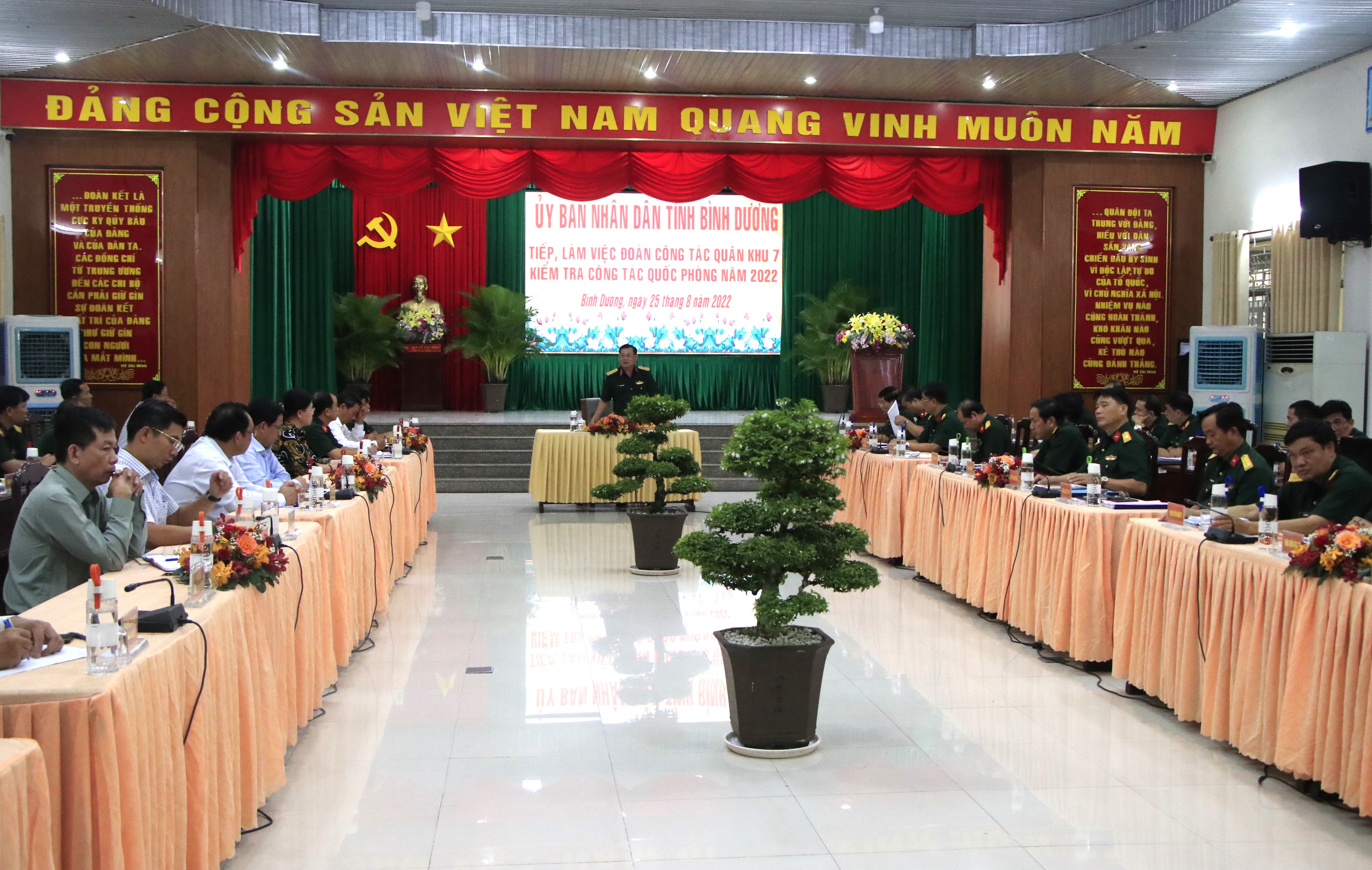 Đoàn đã tiến hành kiểm tra tại Bộ CHQS tỉnh và một số sở, ngành của tỉnh Bình Dương. Nội dung kiểm tra về công tác lãnh đạo, chỉ đạo, quán triệt các văn bản của Đảng, Nhà nước, hướng dẫn của Bộ Quốc phòng, Quân khu 7 về công tác quân sự, quốc phòng địa phương; công tác tham mưu Tỉnh ủy, UBND tỉnh ban hành các văn bản, kế hoạch, quy hoạch, đề án, chương trình hành động về quân sự, quốc phòng. Kết quả thực hiện công tác giáo dục quốc phòng và an ninh; kết hợp phát triển kinh tế xã hội với quốc phòng; xây dựng, củng cố tiềm lực khu vực phòng thủ; hệ thống công trình phòng thủ dân sự; xây dựng bộ đội địa phương, dân quân tự vệ, dự bị động viên, tuyển quân, tuyển sinh quân sự hàng năm; thực hiện các chế độ chính sách liên quan đến quốc phòng; bảo đảm ngân sách quốc phòng…