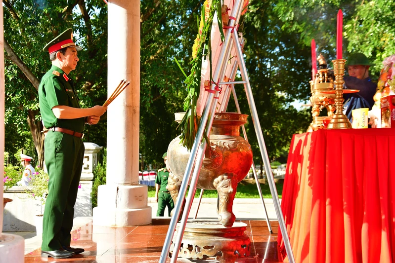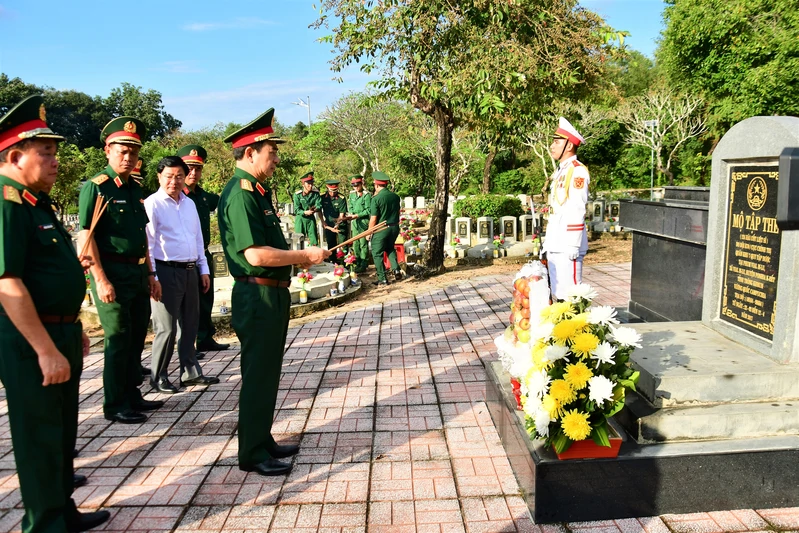 Thiếu tướng Trần Vinh Ngọc, Bí thư Đảng ủy, Chính ủy Quân khu dâng hương mộ tập thể các liệt sĩ.