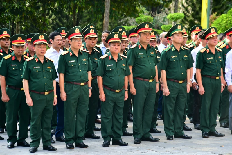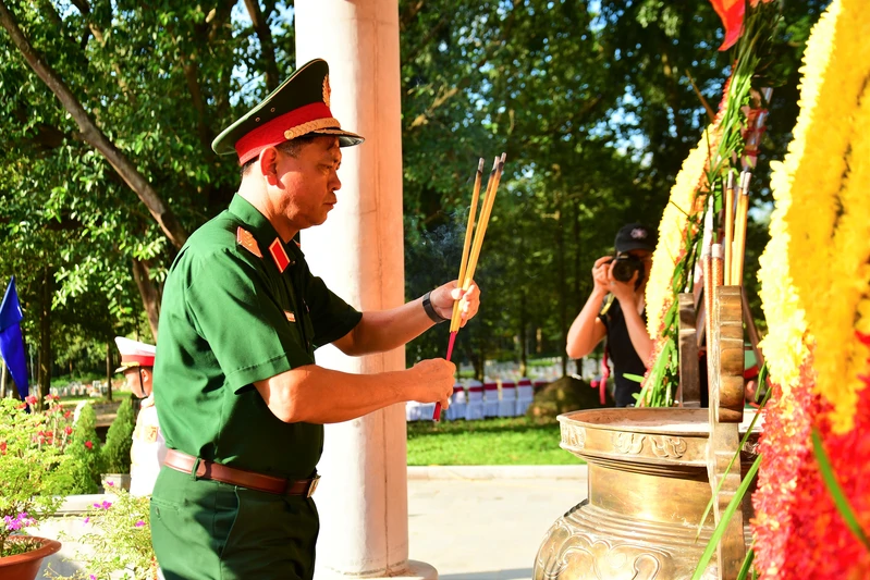 Đoàn công tác Quân ủy Trung ương, Bộ Quốc phòng đặt vòng hoa, dâng hương và dành phút mặc niệm bày tỏ lòng thành kính, biết ơn các anh hùng liệt sĩ đã anh dũng hy sinh vì độc lập, tự do của dân tộc và nhiệm vụ quốc tế cao cả.