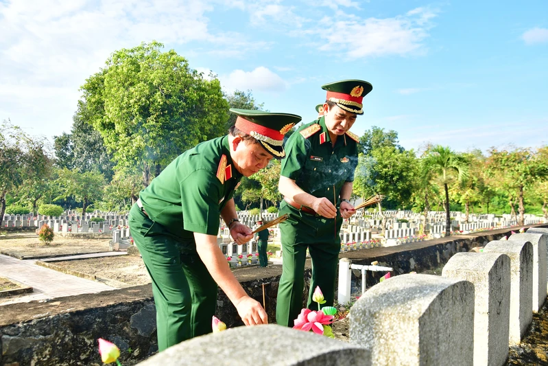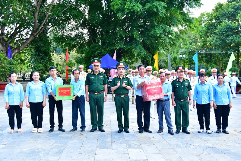 Đại tướng Phan Văn Giang, Ủy viên Bộ Chính trị, Phó Bí thư Quân ủy Trung ương, Bộ trưởng Bộ Quốc phòng; Thiếu tướng Lê Xuân Thế, Tư lệnh Quân khu 7 và Thiếu tướng Trần Vinh Ngọc, Chính ủy Quân khu tặng quà Ban quản lý nghĩa trang.
