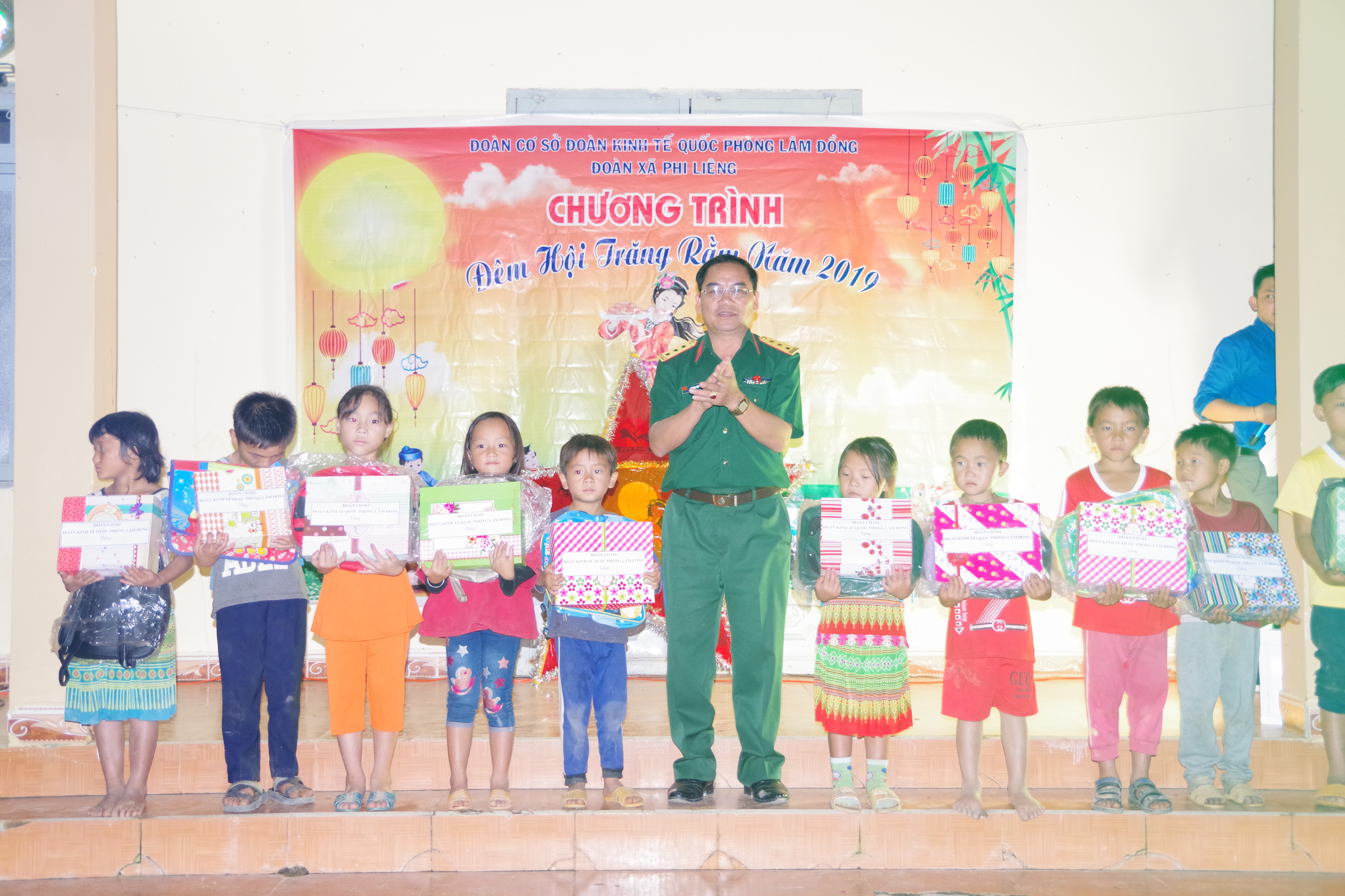 Đúng 18 giờ đồng bào trong thôn đã tập trung đưa con cháu đến rất đông tại sân trường mẫu giáo của thôn, nơi mà Đoàn Cơ sở Đoàn KT-QP Lâm Đồng tổ chức vui Tết trung thu. Bằng những bàn tay khéo léo và lòng nhiệt huyết của tuổi trẻ, Đoàn KT-QP Lâm Đồng đã tranh thủ những ngày nghỉ, giờ nghỉ và buổi tối làm đèn ông sao tặng các cháu không có điều kiện nơi vùng sâu này; Trung thu năm nay cán bộ chiến sĩ và trí thức trẻ của Đoàn đã làm hơn 100 đèn ông sao, tặng 250 suất bánh kẹo, và 30 suất quà là vở và sách đã qua sử dụng mà các bạn đã gom được để dành tặng các em nghèo vượt khó học giỏi.