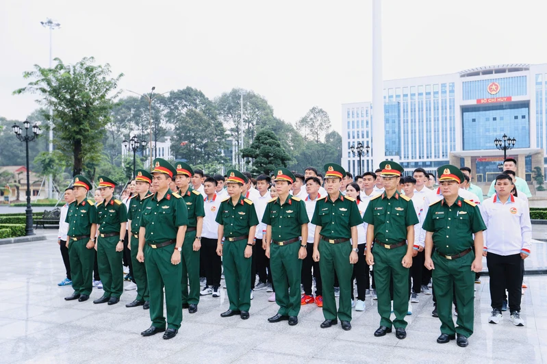 Đại tá Lê Xuân Bình cùng thủ trưởng các cơ quan Quân khu, ban huấn luyện và các vận động viên tham gia Hội thao thực hiện nghi thức dâng hương Chủ tịch Hồ Chí Minh.