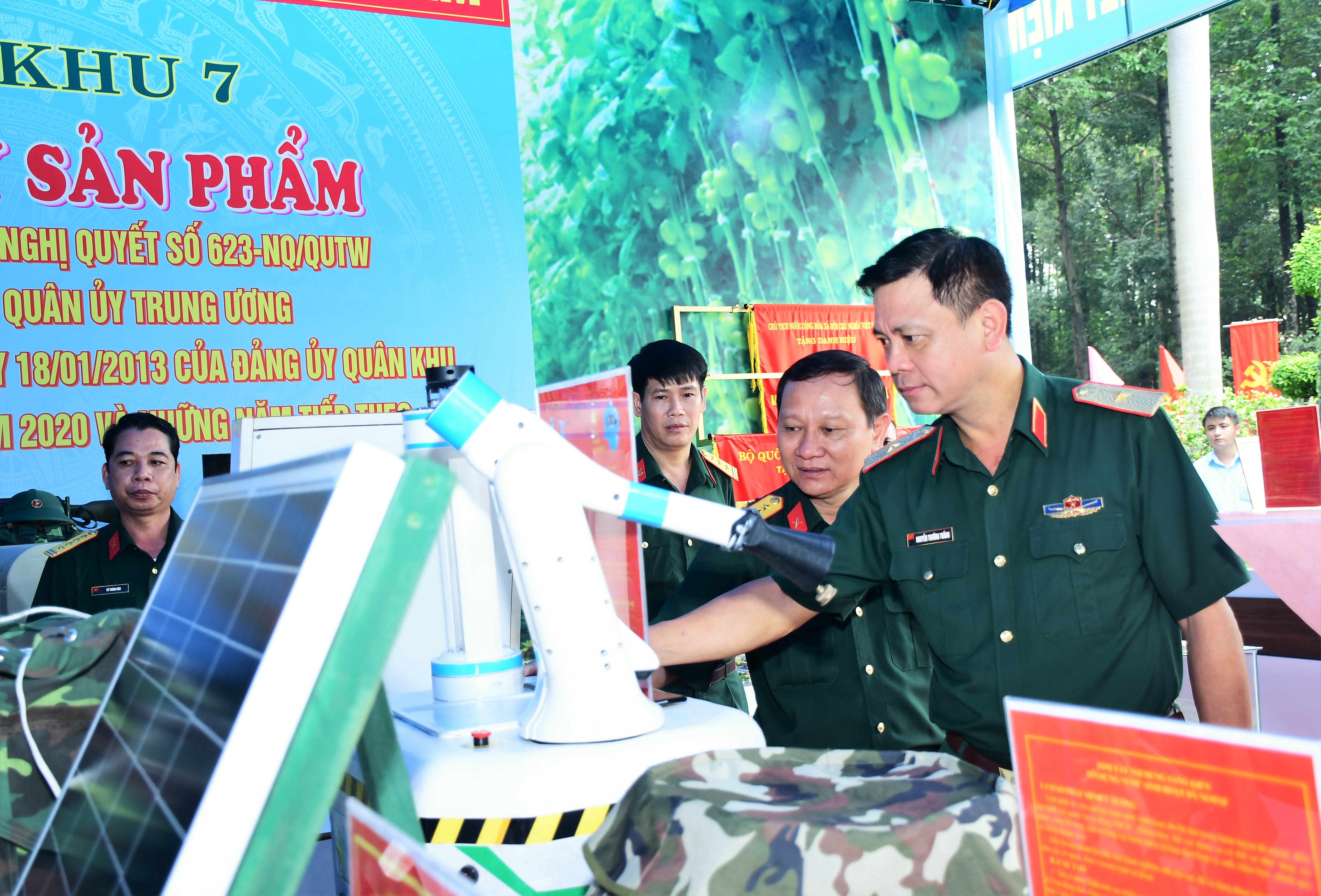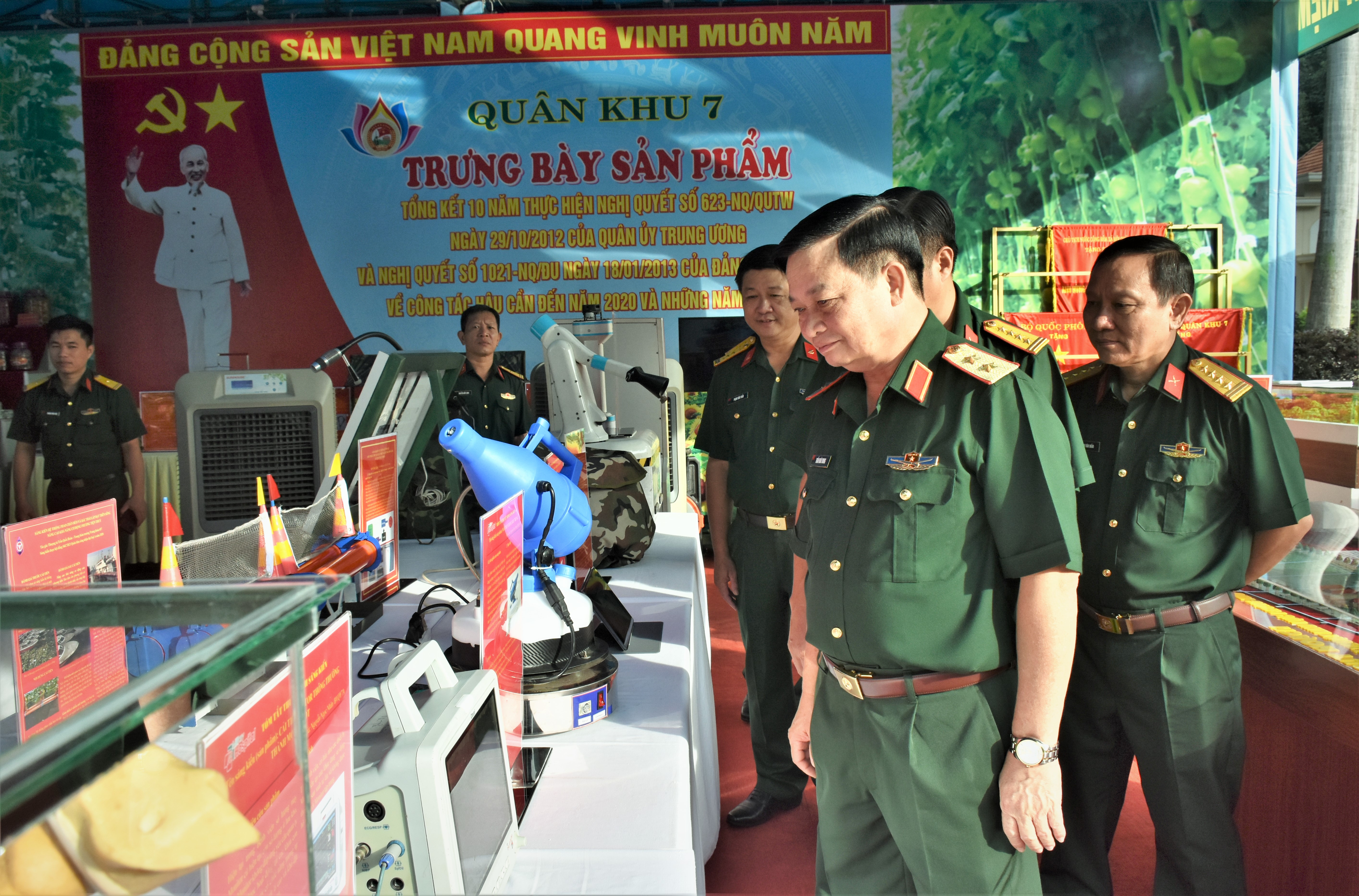 Thiếu tướng Nguyễn Trường Thắng, Ủy viên Trung ương Đảng, Tư lệnh Quân khu tham quan các sáng kiến trong công tác hậu cần của LLVT Quân khu.