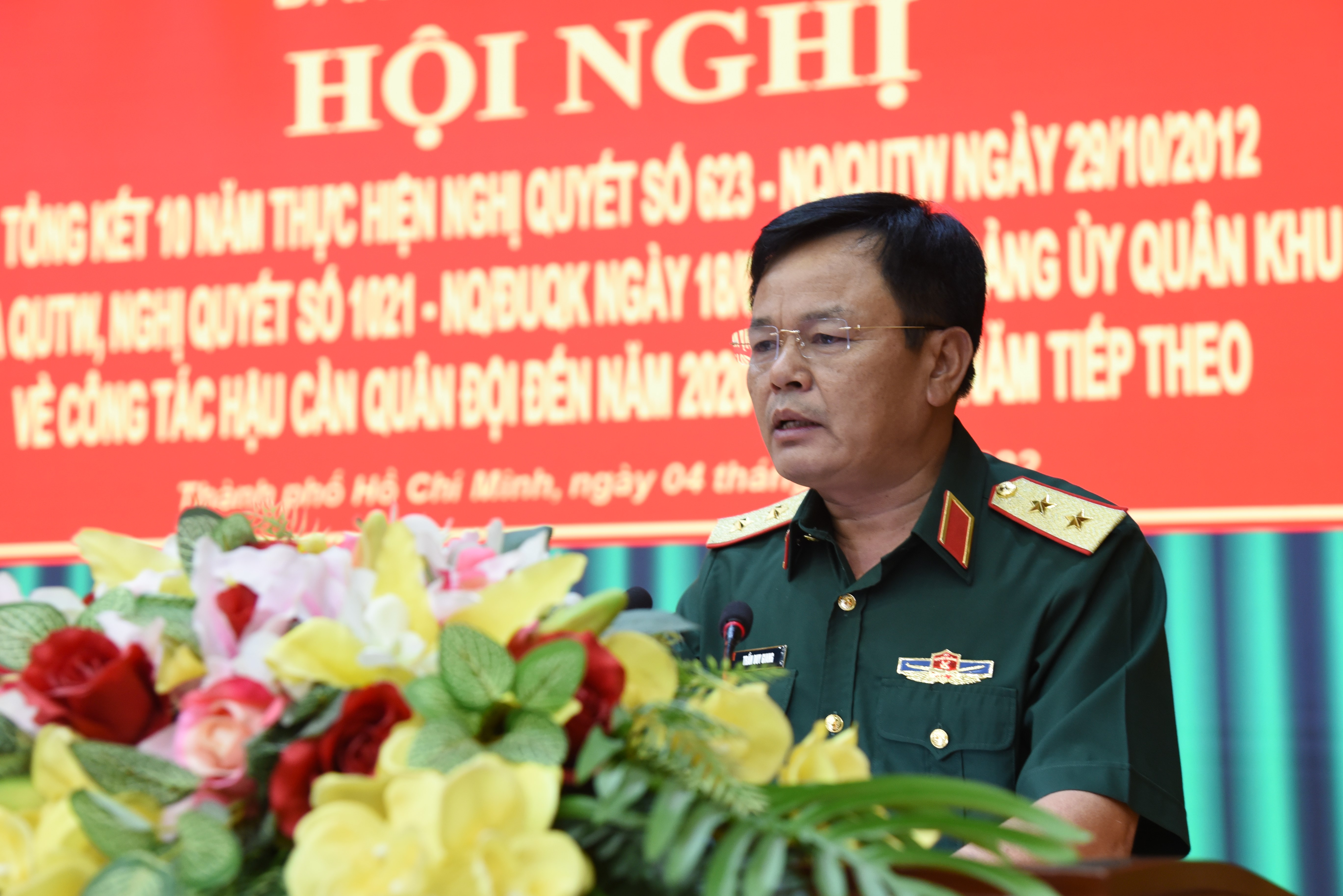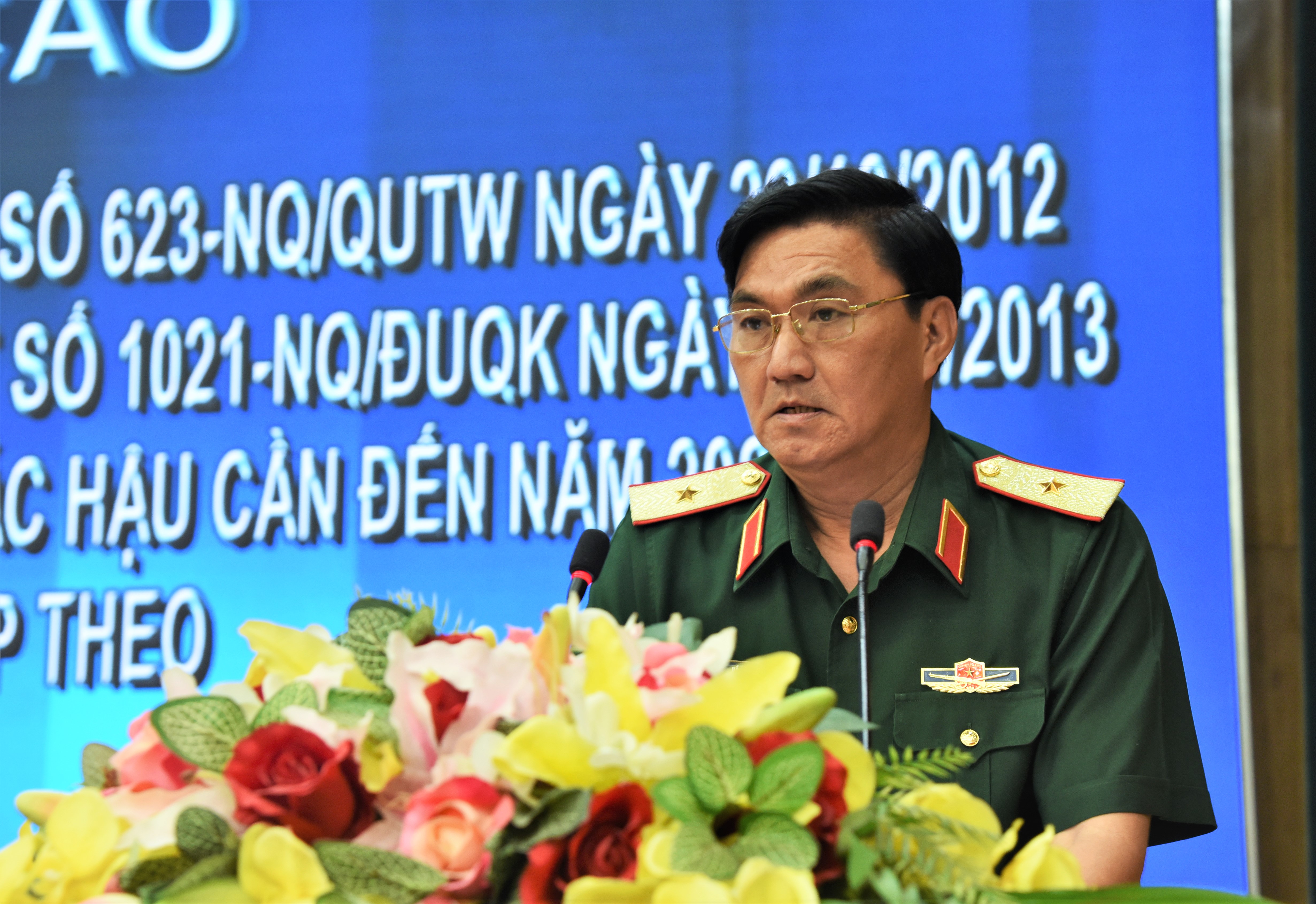 Thiếu tướng Võ Văn Thi, Phó Tư lệnh Quân khu trình bày báo cáo kết quả thực hiện Nghị quyết số 623 của Quân ủy Trung ương và Nghị quyết số 1021 của Đảng ủy Quân khu.