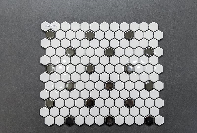Gạch mosaic lục giác: Gạch mosaic lục giác được hình thành từ những viên lục giác nhỏ kết thành vỉ gạch 300×300mm. Loại gạch này được sản xuất từ nhiều chất liệu khác nhau gạch men ceramic, gạch porcelain, gạch men rạn hay đá tự nhiên… Do đó, có thể sử dụng gạch mosaic lục giác để lát sàn và ốp tường.