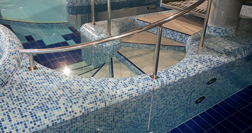 Mosaic thủy tinh là lựa chọn hàng đầu cho hồ bơi vì chống thấm, chịu hóa chất và tạo hiệu ứng màu nước sâu hơn. Dưới ánh mặt trời, mỗi viên mosaic phản chiếu ánh sáng tạo nên bức tranh rực rỡ.