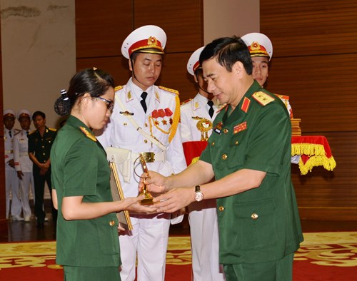 Trung tướng Phan Văn Giang trao Bằng khen của Bộ trưởng Bộ Quốc phòng và Kỷ niệm chương tặng học viên tốt nghiệp thủ khoa, xuất sắc.