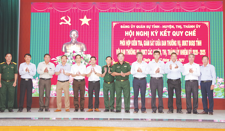 Đảng ủy Quân sự tỉnh đã ký kết quy chế và kế hoạch phối hợp hoạt động giữa Ban Thường vụ và Ủy Ban kiểm tra Đảng ủy Quân sự tỉnh với Ban Thường vụ và Ủy ban kiểm tra Đảng ủy 10 huyện, thị xã, thành phố. Hàng quý, 6 tháng và năm đều có kế hoạch phối hợp kiểm tra, giám sát, báo cáo, thông tin trao đổi. Từ năm 2015 đến nay, cấp ủy các cấp và Ủy ban kiểm tra đã phối hợp kiểm tra 218 lượt tổ chức Đảng, 603 lượt đảng viên; giám sát 128 tổ chức Đảng, 336 lượt đảng viên. Nội dung tập trung vào việc thực hiện nhiệm vụ, chức trách được giao; chấp hành các chỉ thị, nghị quyết của Đảng, pháp luật Nhà nước, kỷ luật Đảng, kỷ luật Quân đội; rèn luyện phẩm chất đạo đức, lối sống, nhất là thực hiện học tập làm theo tư tưởng, đạo đức, phong cách Hồ Chí Minh, trách nhiệm nêu gương của cán bộ, đảng viên và việc khắc phục kiểm điểm tự phê bình và phê bình theo tinh thần Nghị quyết Trung ương 4 (khoá XI, khoá XII).