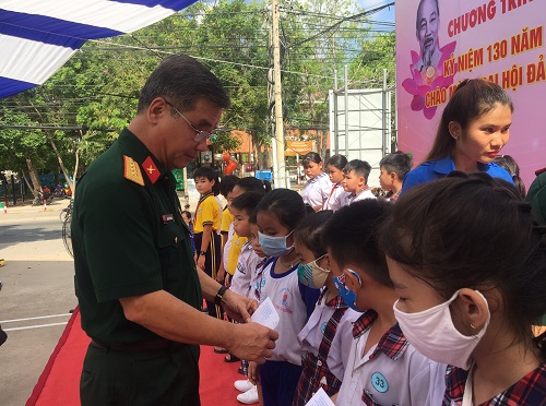 Đại tá Nguyễn Tuấn Bảo, Phó Chính ủy BTL TP. Hồ Chí Minh trao học bổng cho các em học sinh nghèo hiếu học.