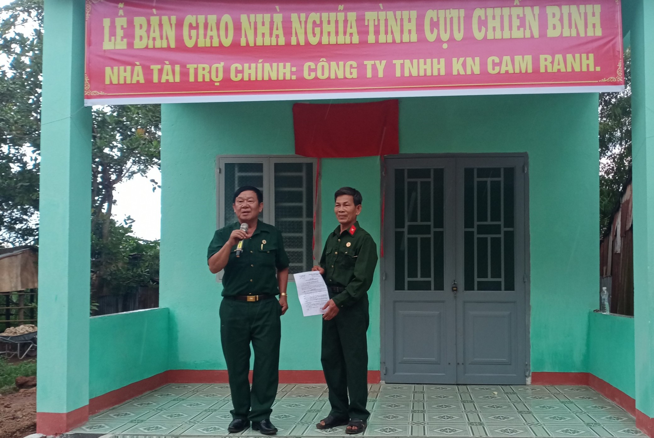 Chủ tịch Hội CCB tỉnh Bình Phước Huỳnh Văn Nước (bên trái) trao quyết định tặng nhà Nghĩa tình Cựu chiến binh cho hội viên Huỳnh Văn Tiếp.
