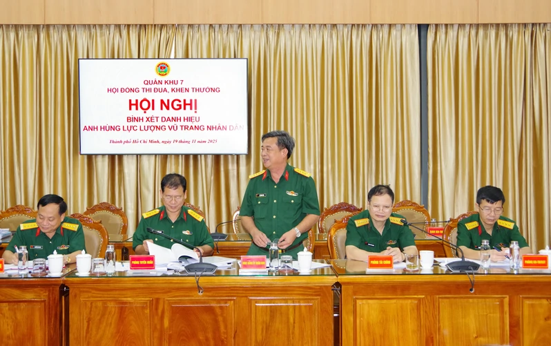 (QK7 Online) - Ngày 19/11, Hội đồng Thi đua, khen thưởng (TĐKT) Quân khu 7 tổ chức Hội nghị bình xét đề nghị phong tặng danh hiệu Anh hùng Lực lượng vũ trang nhân dân (LLVTND). Thiếu tướng Trần Vinh Ngọc, Bí thư Đảng ủy, Chính ủy Quân khu, Chủ tịch Hội đồng TĐKT Quân khu chủ trì hội nghị.
