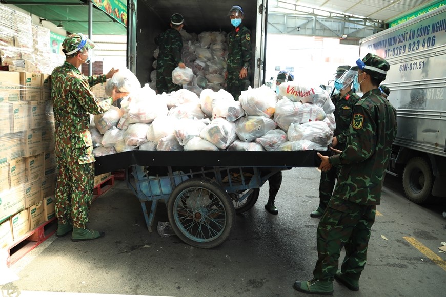 Chiến sĩ Sư đoàn 7, Quân đoàn 4 cung cấp nhu yếu phẩm cho Nhân dân phường Thuận Giao, TP Thuận An, Bình Dương.