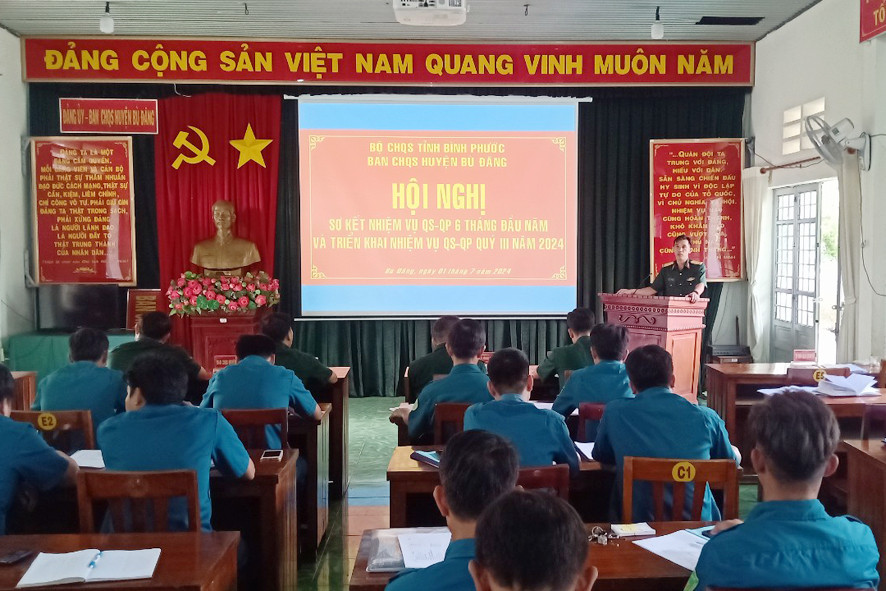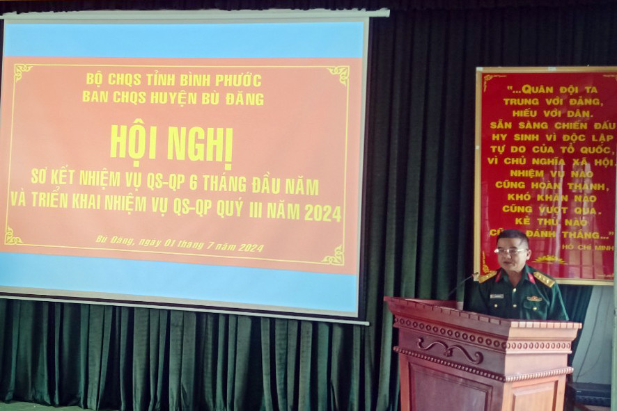 (QK7 Online) - Ngày 1/7, Ban CHQS huyện Bù Đăng tổ chức hội nghị sơ kết nhiệm vụ quân sự, quốc phòng 6 tháng đầu năm và triển khai nhiệm vụ quý III năm 2024. Thượng tá Phan Minh Bảy, Ủy viên Thường vụ Huyện ủy, Chỉ huy trưởng Ban Chỉ huy Quân sự huyện chủ trì hội nghị.