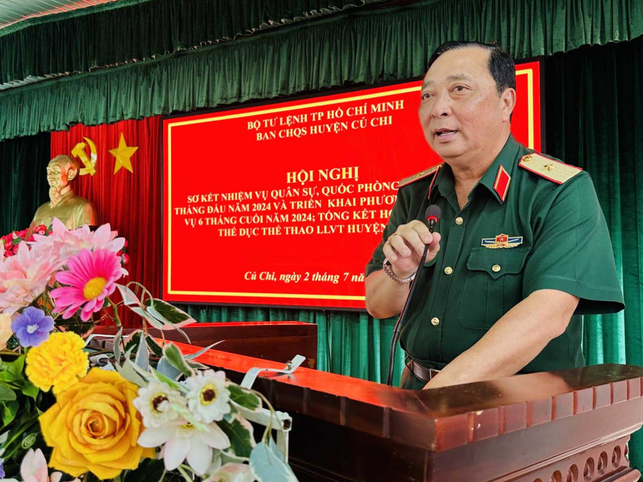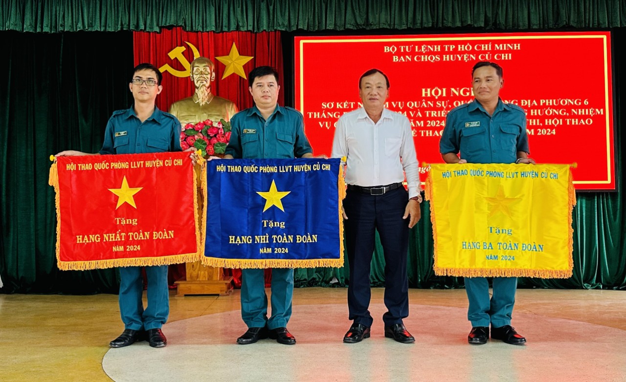 (QK7 Online) - Ngày 2/7, Ban CHQS huyện Củ Chi, TP. Hồ Chí Minh tổ chức Hội nghị sơ kết nhiệm vụ quân sự, quốc phòng địa phương 6 tháng đầu năm 2024 và tổng kết Hội thi, hội thao thể dục thể thao LLVT huyện năm 2024. Dự hội nghị có Thiếu tướng Trần Văn Trai, Phó Tư lệnh Bộ Tư lệnh Thành phố; đồng chí Lê Đình Đức, Phó Chủ tịch UBNDhuyện.Trung tá Lê Xuân Thái, Chỉ huy trưởng Ban CHQS huyện chủ trì hội nghị.