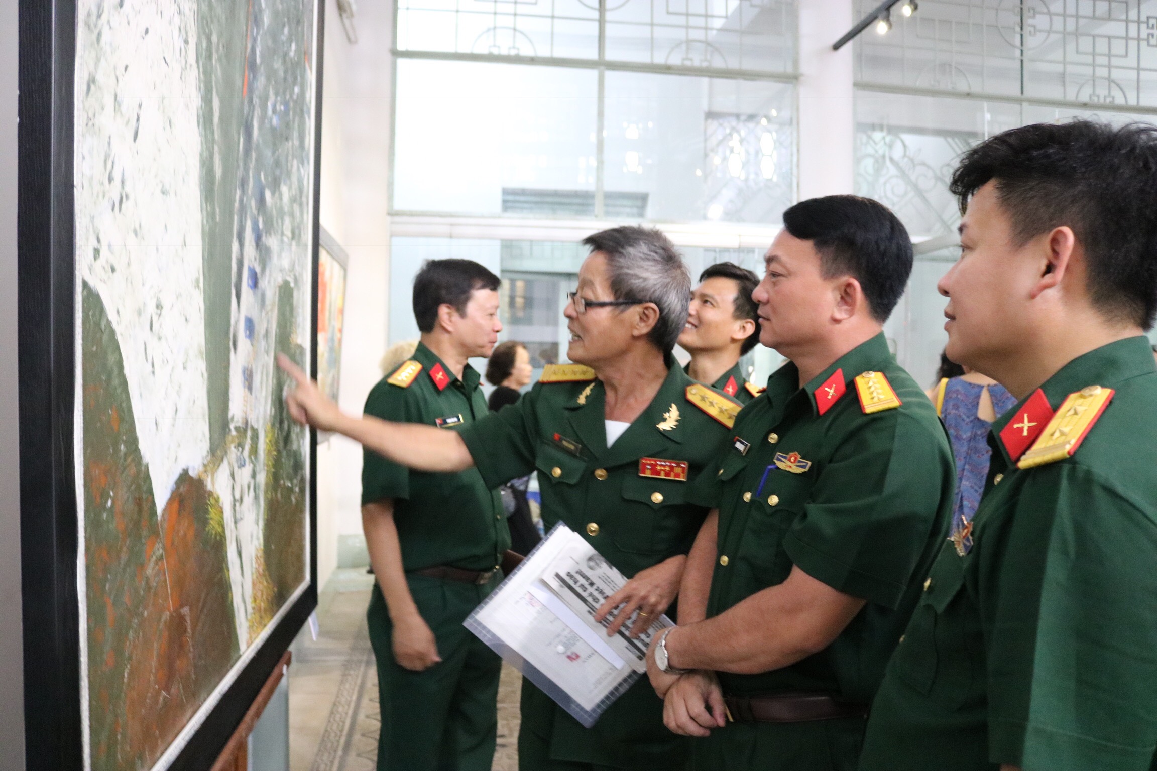Thiếu tướng Lê Xuân Sang và Đại tá Nguyễn Công Anh (bìa phải) tham quan tác phẩm “Giữ từng góc phố” – Khắc gỗ của họa sỹ Cao Trọng Thiềm.