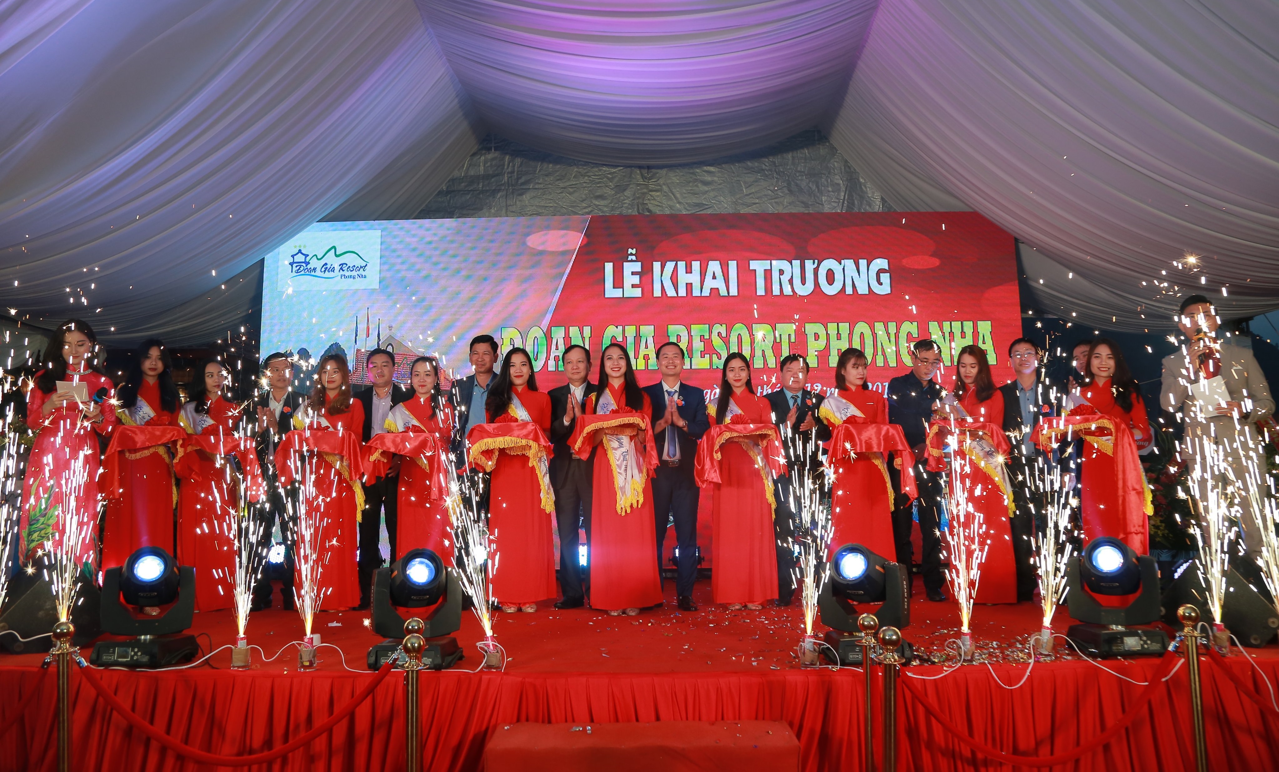 Ông Đoàn Xuân Tiến và đại diện các khách mời cắt băng khai trương Đoàn Gia Resort Phong Nha