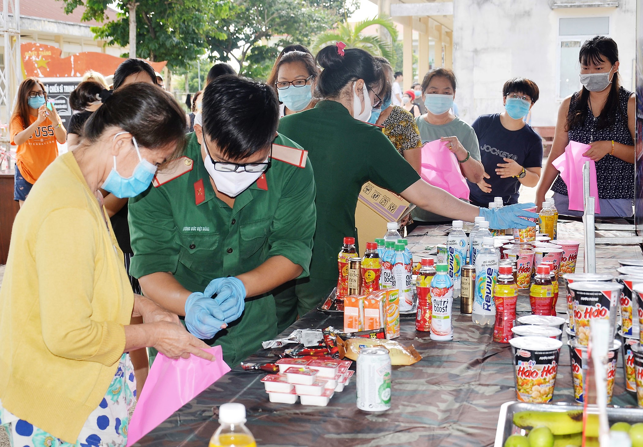 Cán bộ, chiến sĩ phát nhu yếu phẩm cho công dân đang cách ly tại Trung đoàn Minh Đạm.
