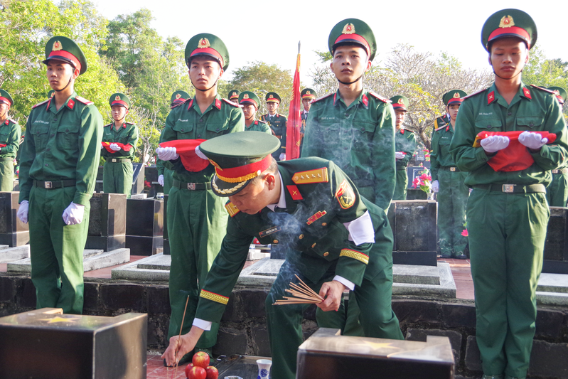 Đại tá Nguyễn Văn Lộc, Phó Chủ nhiệm Chính trị Quân khu 7 dâng hương tưởng nhớ các liệt sĩ đã anh dũng hy sinh vì sự nghiệp đấu tranh giải phóng dân tộc, xây dựng và bảo vệ Tổ quốc Việt Nam Xã hội Chủ nghĩa.