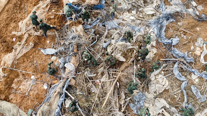 Ghi nhận từng bước thu dọn nhà lưới đầy gian nan của bộ đội công binh tại hiện trường sau lũ.
