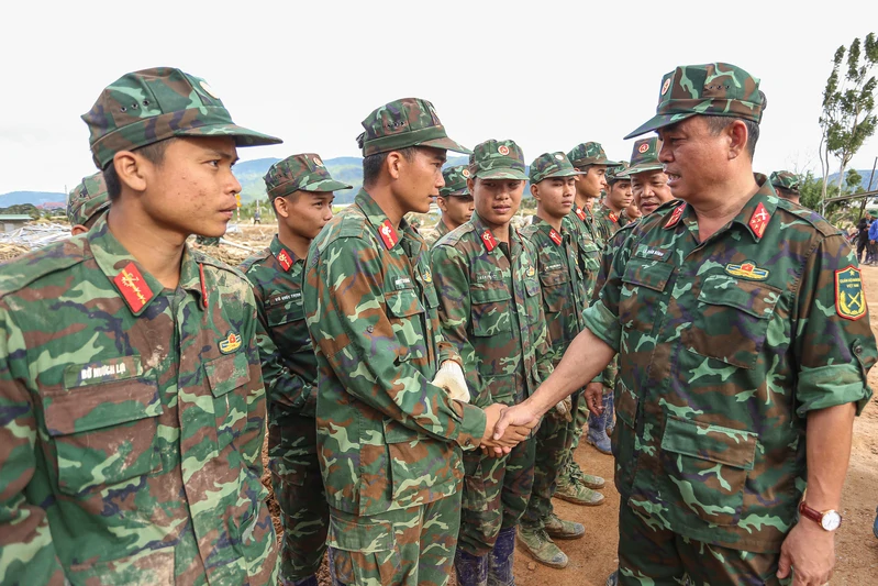Đại tá Lê Xuân Bình, Phó Tư lệnh, Tham mưu trưởng Quân khu 7 thăm, động viên bộ đội tham gia khắc phục hậu quả thiên tai tại Lâm Đồng
