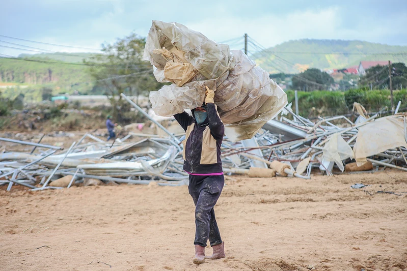 Toàn bộ phần còn lại của nhà lưới chỉ có thể bán ve chai. Người thu mua ve chai trong ảnh đang thu gom từng khung sắt, tấm lưới vỡ nát.