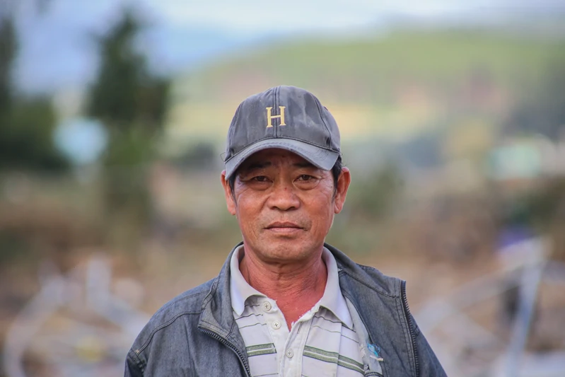 Ánh mắt đượm buồn của ông Hà Di Du khi đứng nhìn toàn bộ khu nhà lưới, nhà kính bị tàn phá, thiệt hại ước khoảng 3 tỷ đồng.