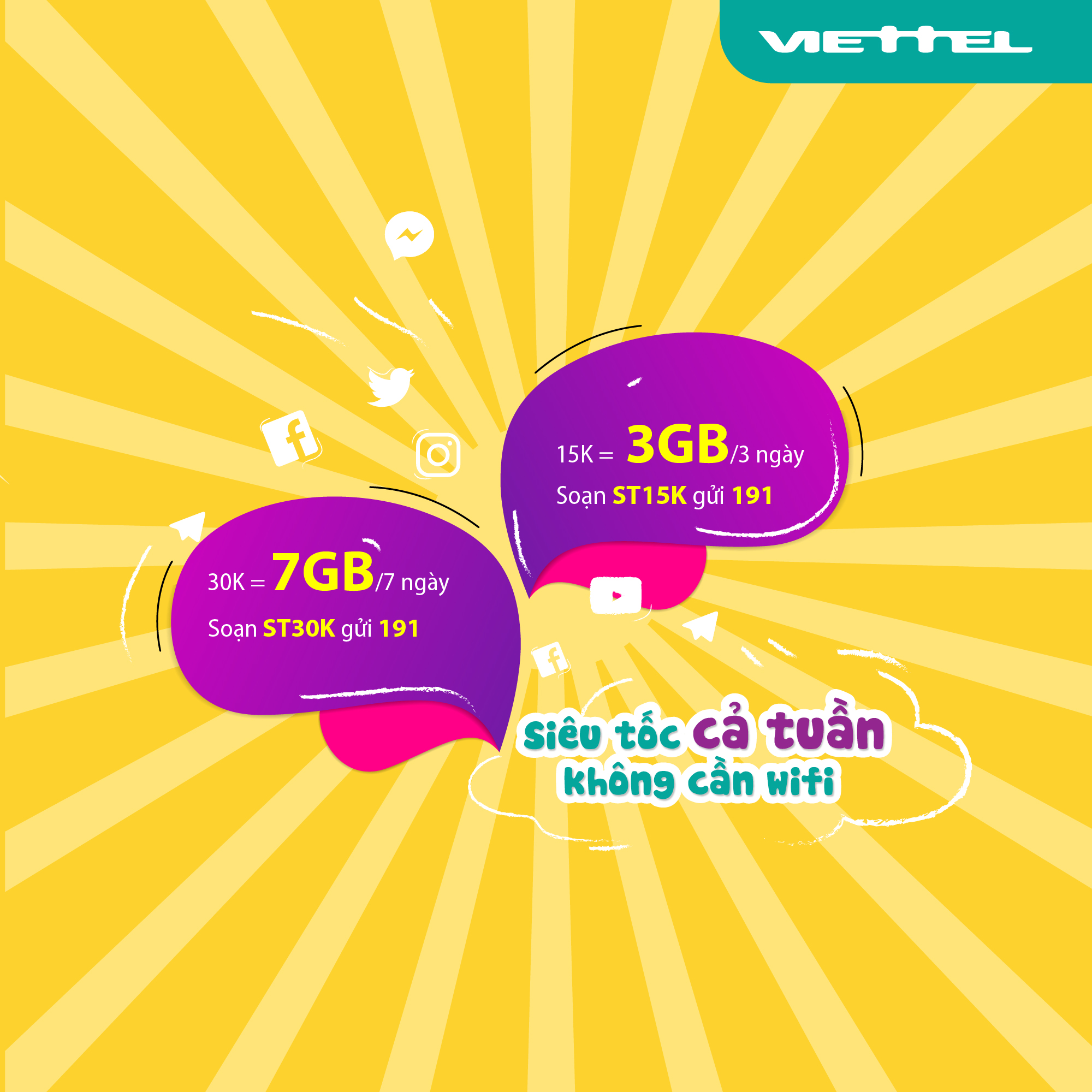Theo đó, với ưu điểm giá cước thấp - dung lượng cao, không phát sinh cước phụ trội, có thể sử dụng trên cả mạng 3G và 4G và không giới hạn số lần đăng ký; 2 gói data siêu tốc được ra mắt tháng 4 này sẽ giúp khách hàng trải nghiệm tốc độ 3G/4G vượt trội với mức phí vô cùng hợp lý: 15.000đ có 3GB, sử dụng trong 3 ngày; 30.000đ có 7GB, sử dụng trong 7 ngày. Gói cước áp dụng cho tất cả các thuê bao Viettel (cả trả trước và trả sau). Để đăng ký, khách hàng chỉ cần soạn ST15K (để đăng ký gói 3GB trong 3 ngày) hoặc ST30K (đăng ký gói 7GB trong 7 ngày) gửi 191.