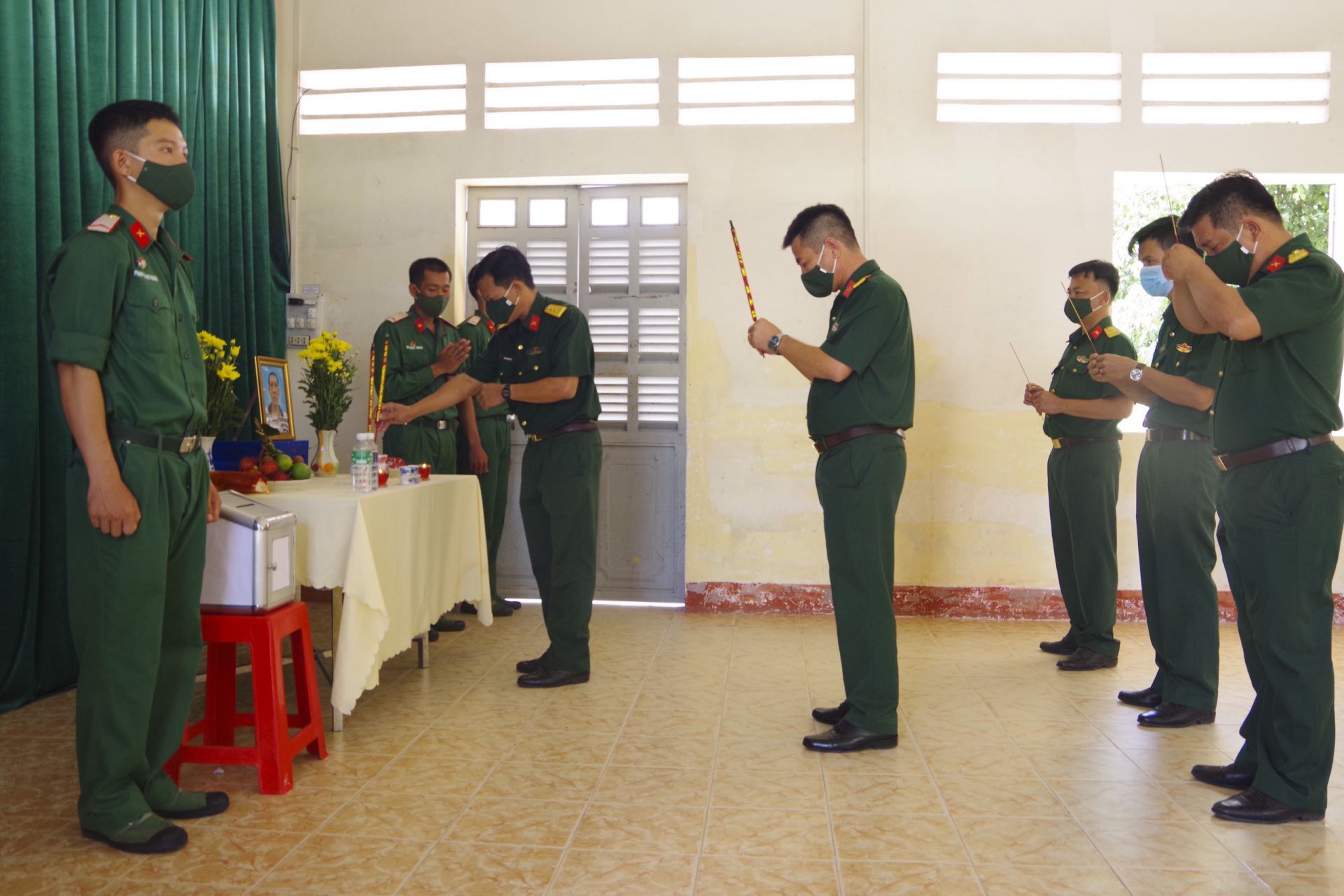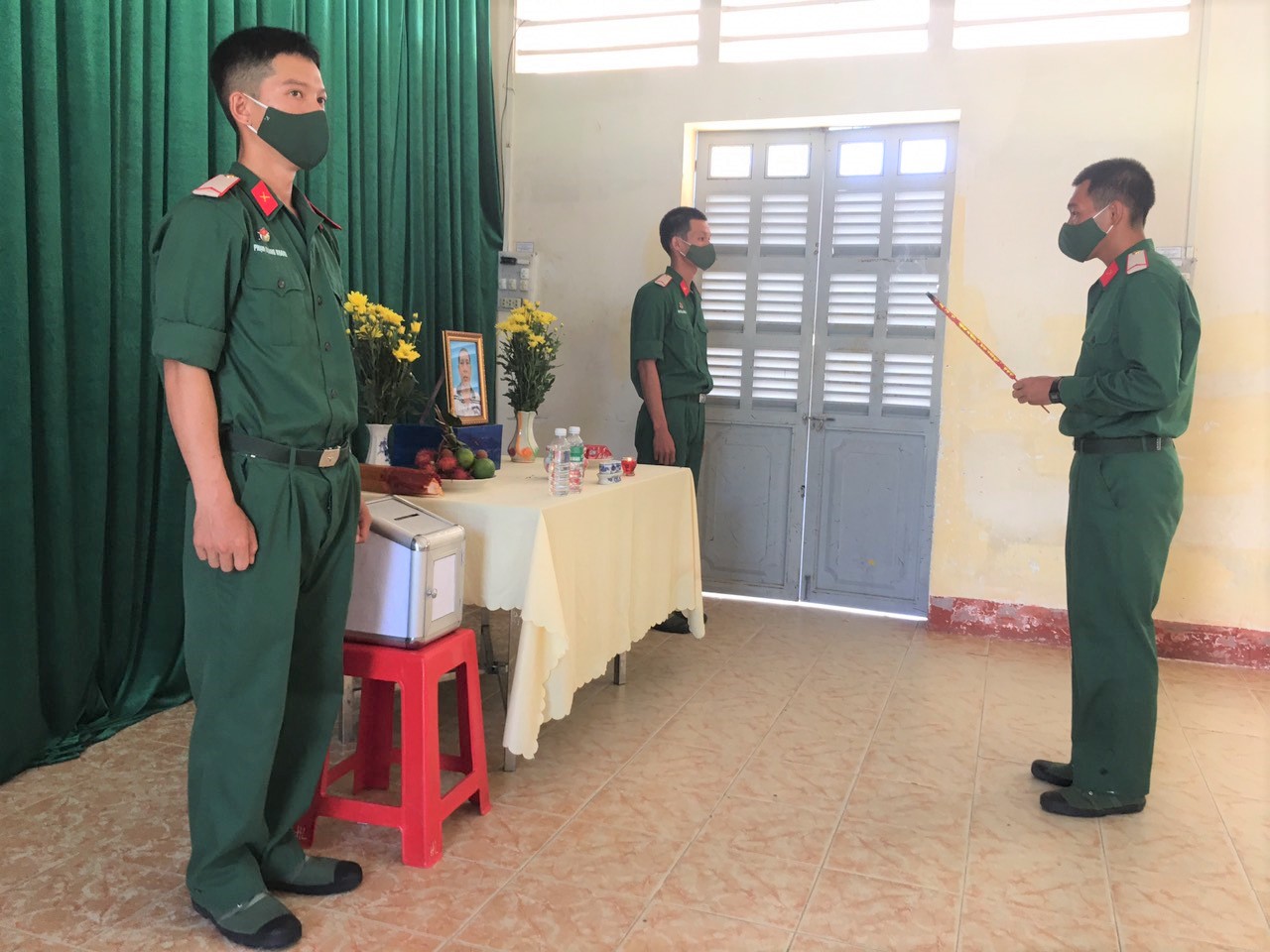Đại úy Hoàng Văn Thắm - Đại đội trưởng, Đại đội 5, Tiểu đoàn 5 cho biết: “Tối cùng ngày, chúng tôi nhận được tin cha của Minh qua đời, ban đầu gia đình có làm đơn xin cho Minh về chịu tang cha, nhưng giữa tình hình dịch bệnh Covid-19 đang diễn biến phức tạp, đơn vị đã giải thích, động viên, chia sẻ để gia đình hiểu cùng đồng lòng chung tay chống dịch, ngay sau đó, được sự nhất trí của Thủ trưởng Sư đoàn, đơn vị đã lập bàn thờ, đặt di ảnh cha của Minh ngay tại phòng giao ban đại đội để Minh cùng đồng đội thắp hương, làm tròn đạo hiếu của một người con”.