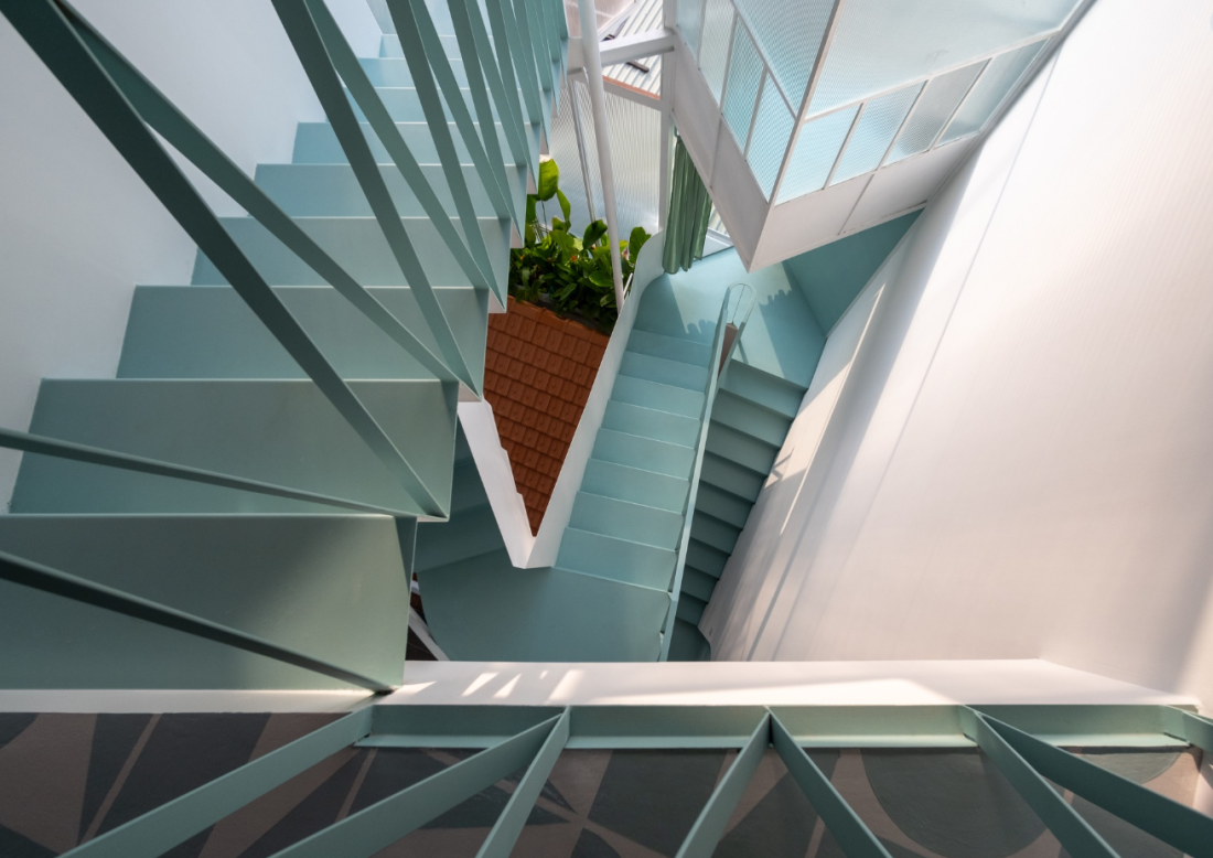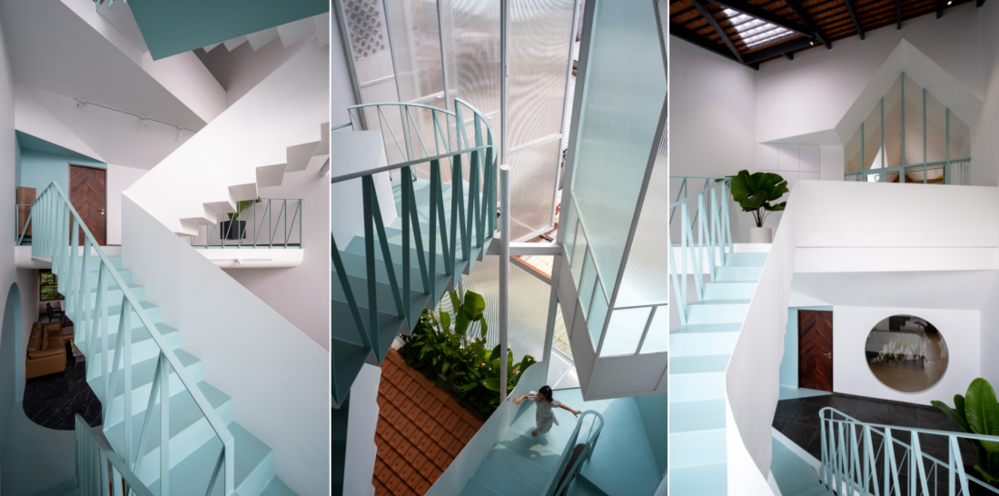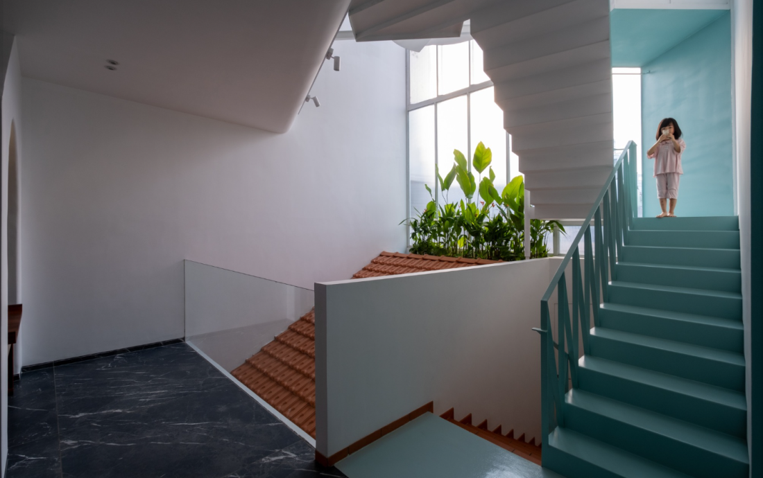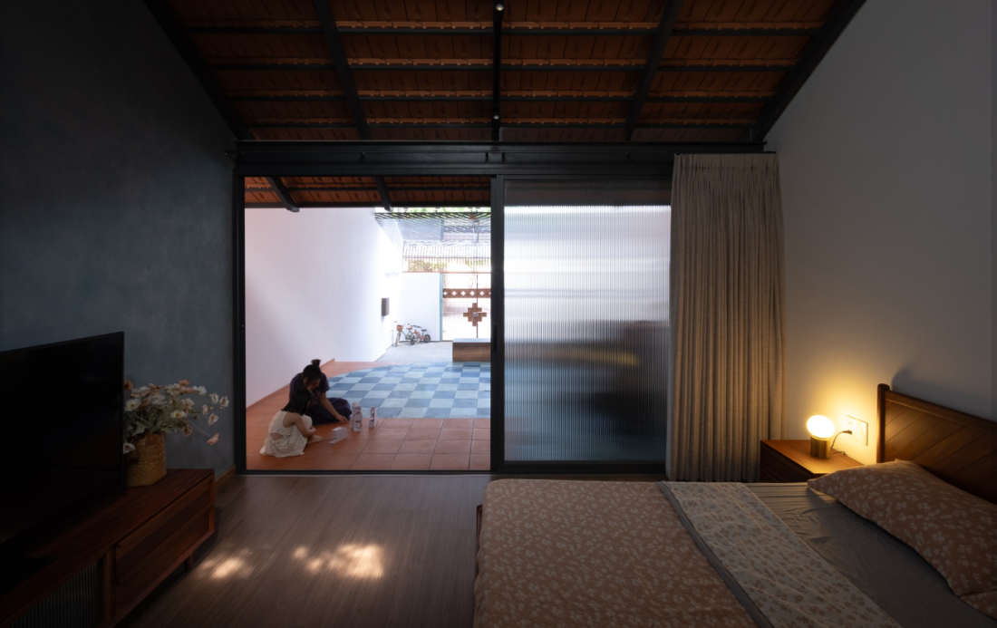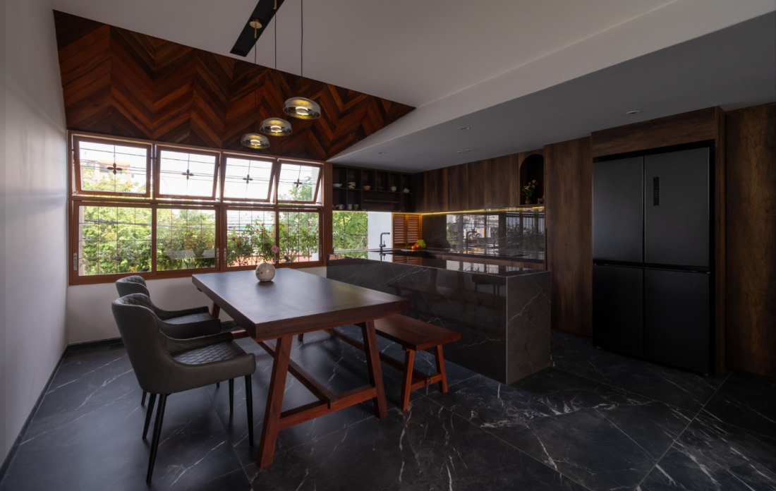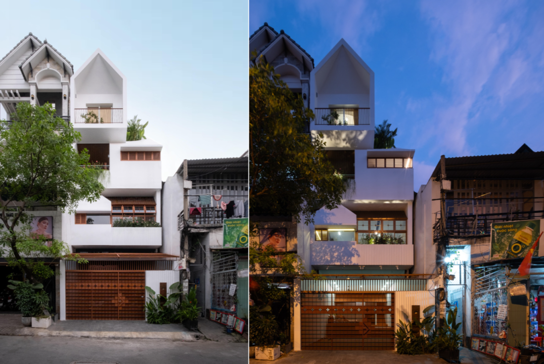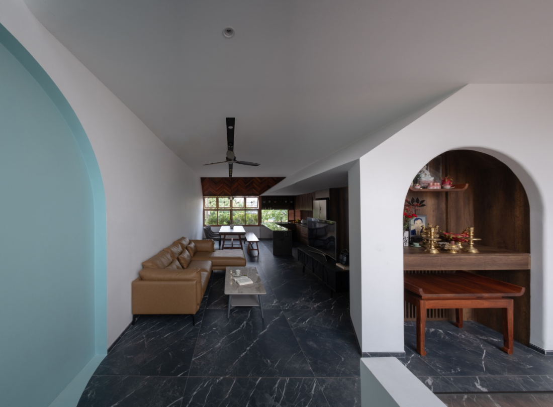Kiến trúc sư đã khéo léo áp dụng đường nét mái dốc xuyên suốt thiết kế, vừa làm mềm đi sự khô cứng của nhà phố, vừa tạo cảm giác thân thuộc cho những ai từng rời xa quê hương. Mái nhà đan xen quanh sân chung như một sợi dây vô hình, kết nối các thế hệ bằng hơi ấm và sự gần gũi.