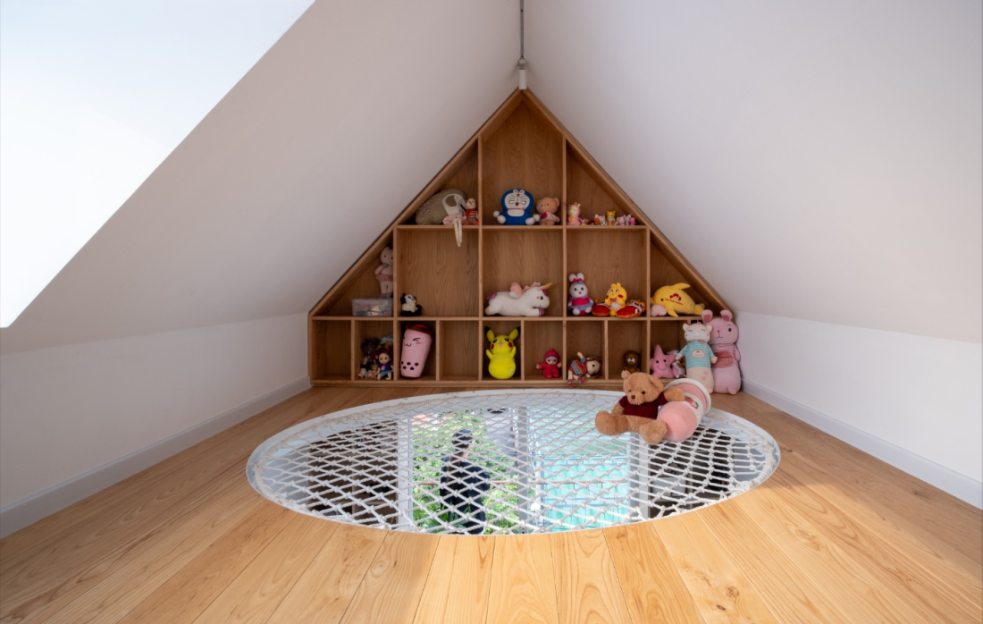 Tầng 4 thiết kế cao trần sẽ là không gian dành riêng cho con. Tại đây không gian được chia làm 2 phần, phần dưới là góc học và phòng ngủ, phần trên gác lửng áp mái là sân chơi.