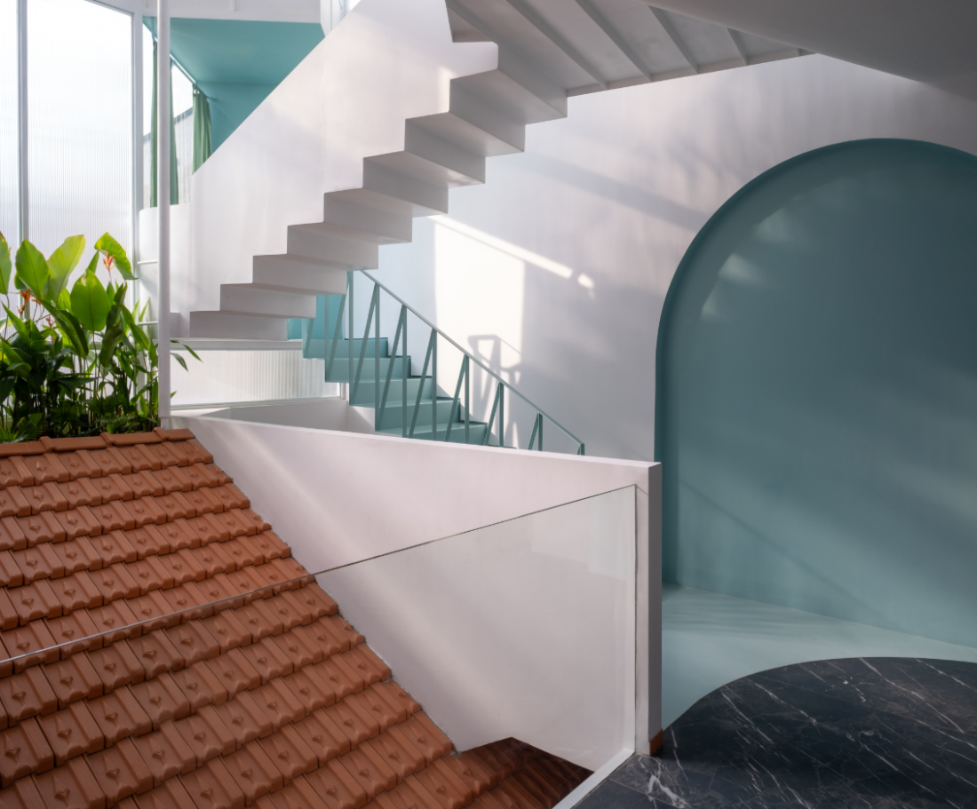 Những sân này được xếp chồng khéo léo và kết nối qua một khoảng trống phía sau, tạo nên sự liền mạch đầy thú vị. Đứng đây, bạn sẽ nghe tiếng gió lùa nhẹ, thấy ánh nắng dịu dàng len lỏi, như thể đang ở một góc quê yên bình.