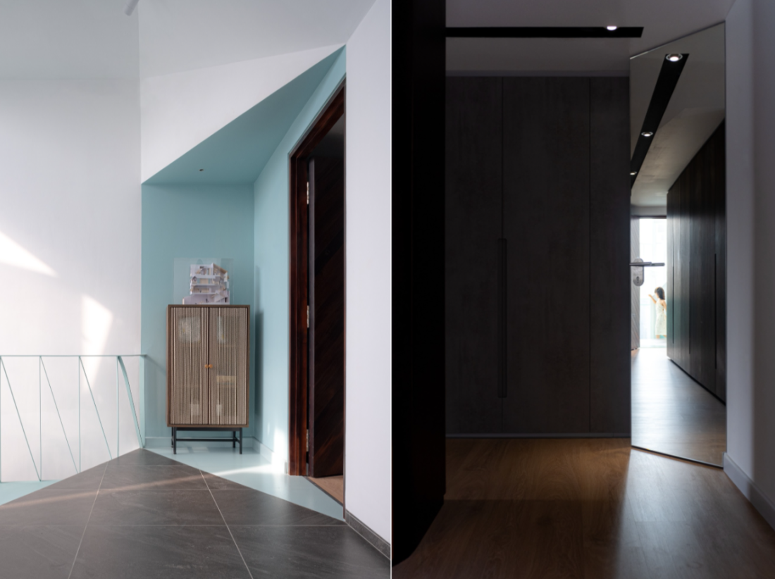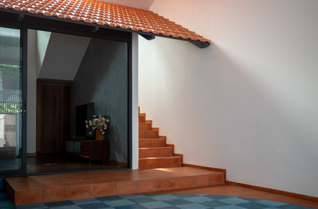 Khác với nhà phố thông thường, tầng trệt sau khi đi qua khoảng sân trước cửa là phòng ngủ nhỏ cửa kính lùa, bên cạnh là cần thang gạch đỏ để đi lên các tầng trên.