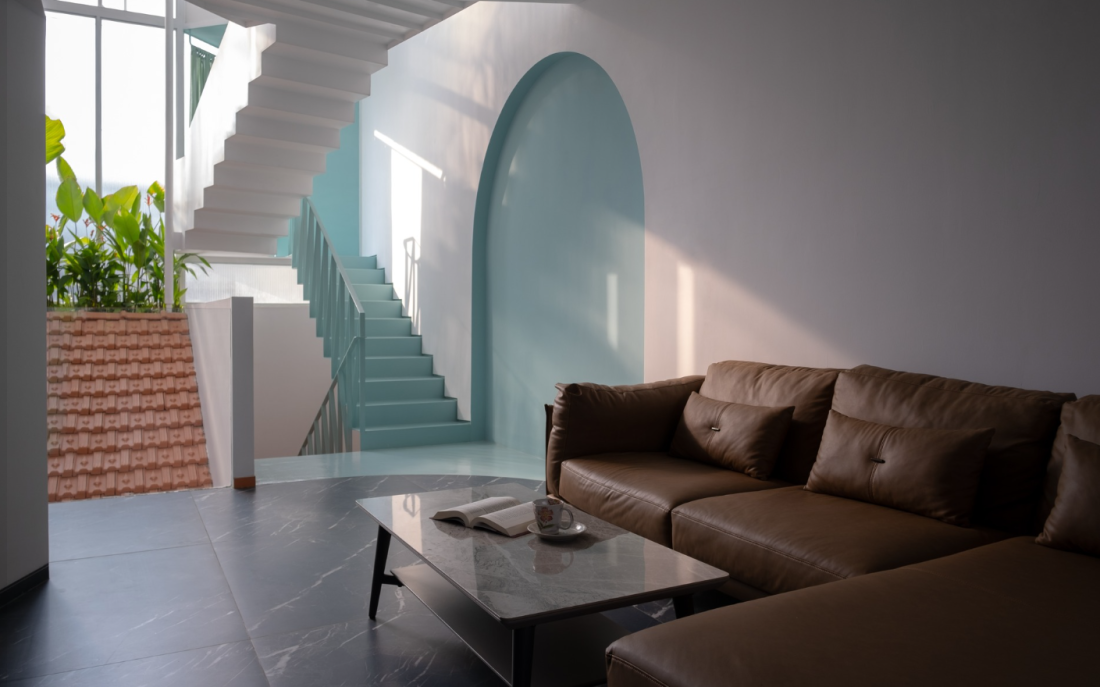 Đi sâu vào bên trong, bạn sẽ bất ngờ với cách mà giếng trời được biến hóa thành một sân nhà thực thụ. Đây chính là giải pháp lấy sáng hay thông gió. Ánh sáng tự nhiên tràn ngập, gió mát lùa qua, mang đến cảm giác thư thái hiếm có giữa lòng thành phố. Mọi không gian trong nhà đều được thiết kế để tối đa hóa sự tương tác – từ phòng khách thoáng đãng đến góc nhỏ đọc sách bên sân.