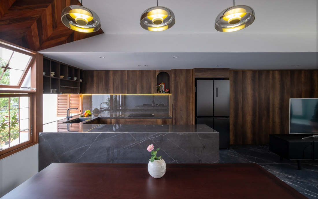 Phòng bếp và khu vực sinh hoạt chung tại tầng 2 được bố trí mở, không tường ngăn, để mọi người dễ dàng trò chuyện, cười đùa trong khi nấu nướng hay thư giãn.