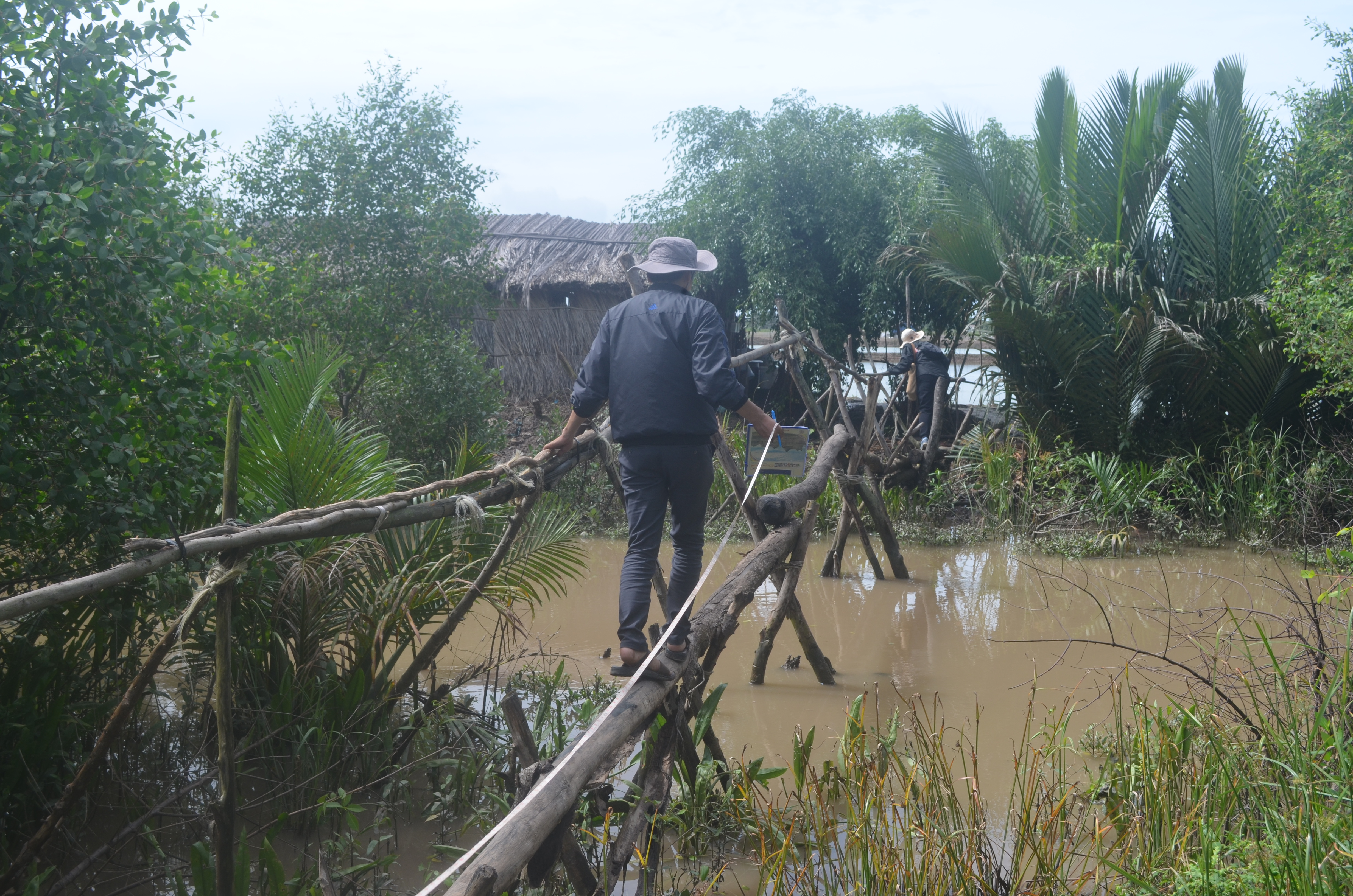 Phần lớn người dân xã Lai Hoà, huyện Vĩnh Châu sử dụng cầu khỉ để qua các con kênh.