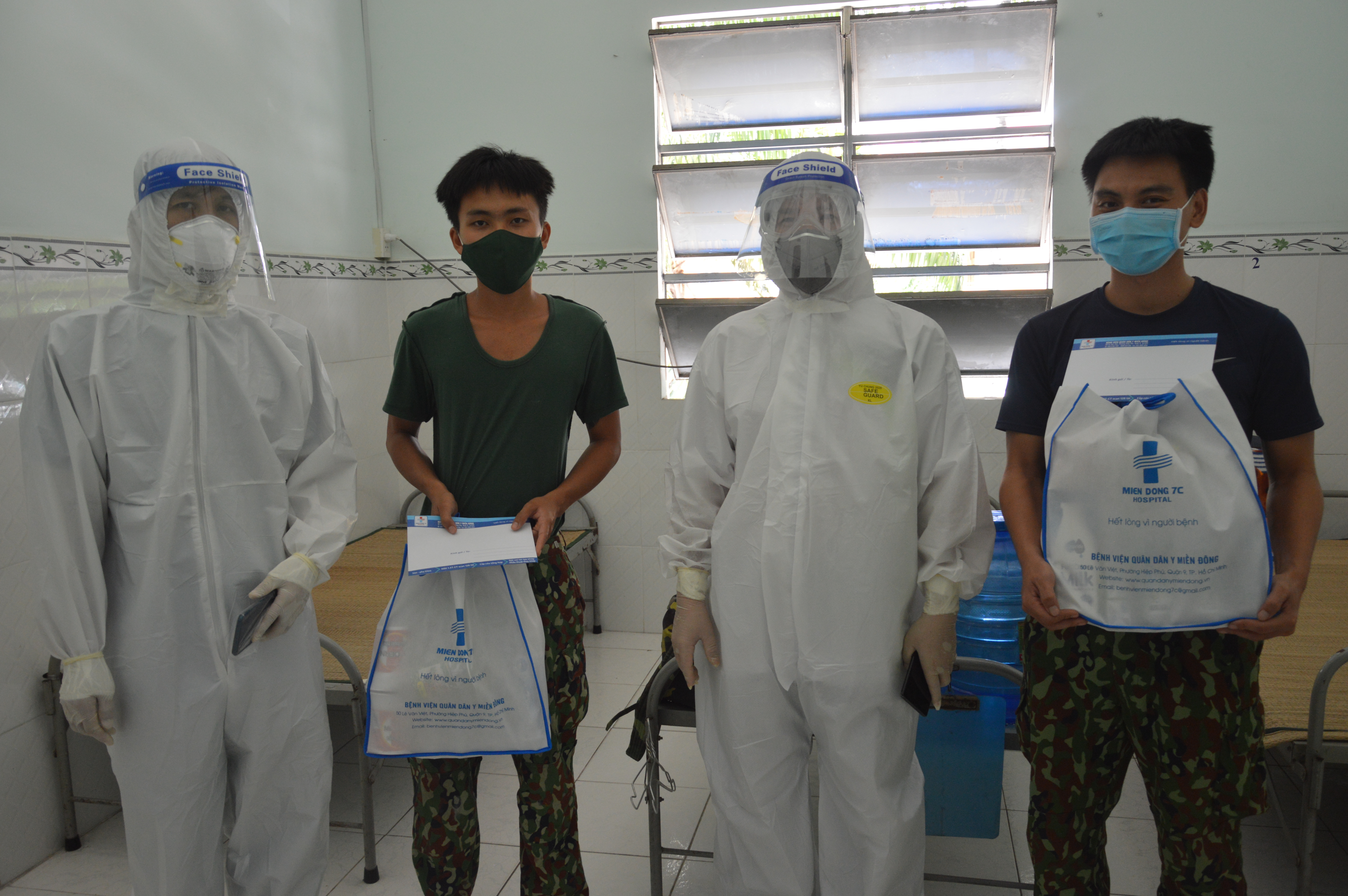 Hàng tháng, bệnh viện còn tổ chức tặng quà 2 lần cho tất cả các bệnh nhân đang điều trị tại bệnh viện. Mỗi phần quà bao gồm sữa tươi, sữa chua, sữa đặc có đường, xúc xích, mì gói, cháo ăn liền, nước suối, rất thiết thực đối với người bệnh. Trung tá Trần Thị Bích Hảo, Tổ trưởng tổ vận động và tiếp nhận tài trợ Ban công tác xã hội bệnh viện cho biết: “Nhờ sự hỗ trợ của các doanh nghiệp, mạnh thường quân, bệnh viện đã có những phần quà ý nghĩa gửi đến các bệnh nhân đang điều trị Covid. Đây cũng là tấm lòng “Tất cả vì người bệnh” của đội ngũ cán bộ, y bác sĩ, nhân viên y tế bệnh viện với mong muốn các bệnh nhân luôn lạc quan, vui vẻ, yên tâm điều trị bệnh để cùng nhau vượt qua, chiến thắng đại dịch Covid-19”.