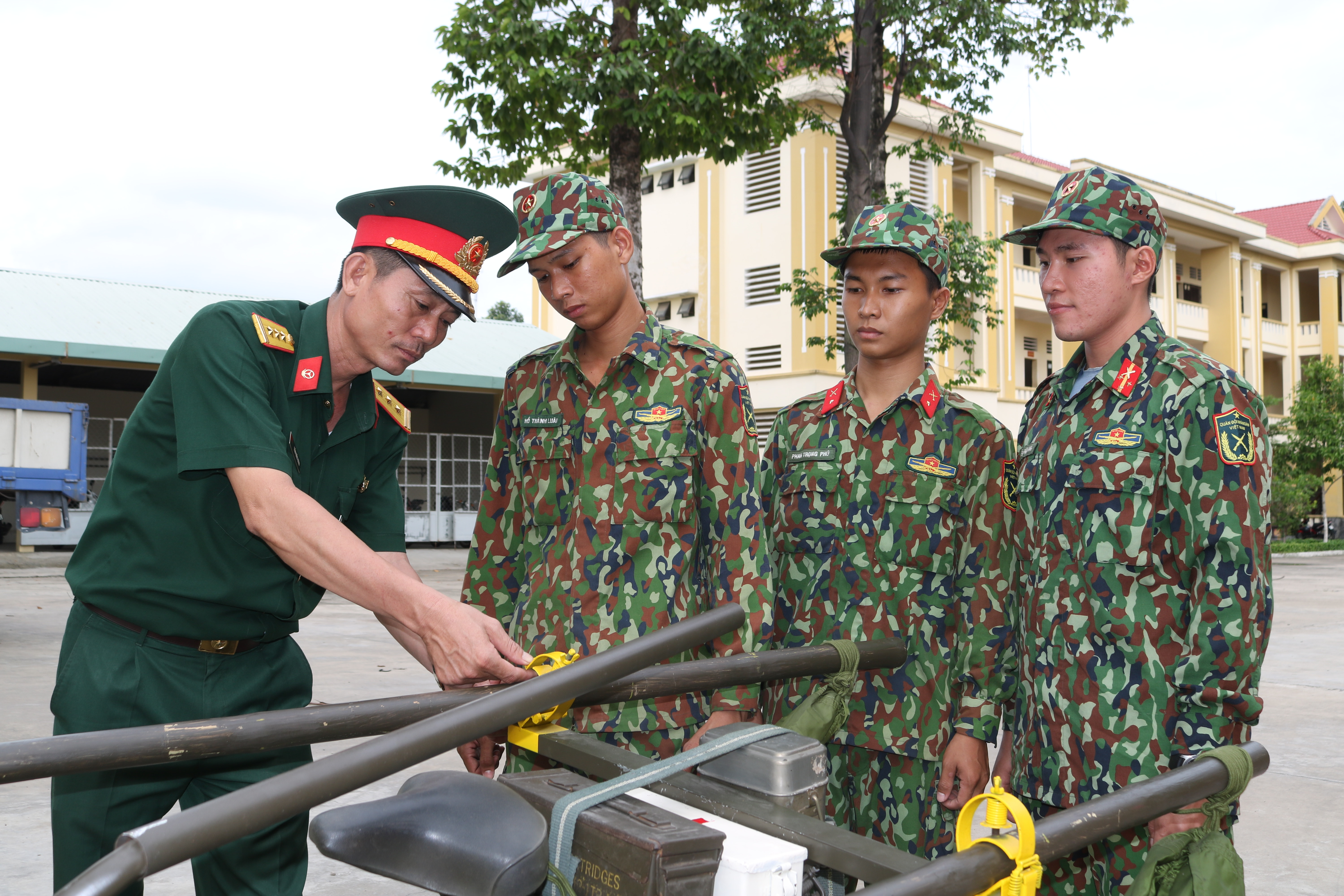 Thượng tá Trần Quốc Hoàn hướng dẫn cách sử dụng sáng kiến: “Khóa hãm cố định cáng thương và các thiết bị đồng bộ lắp đặt trên xe đạp thồ”.