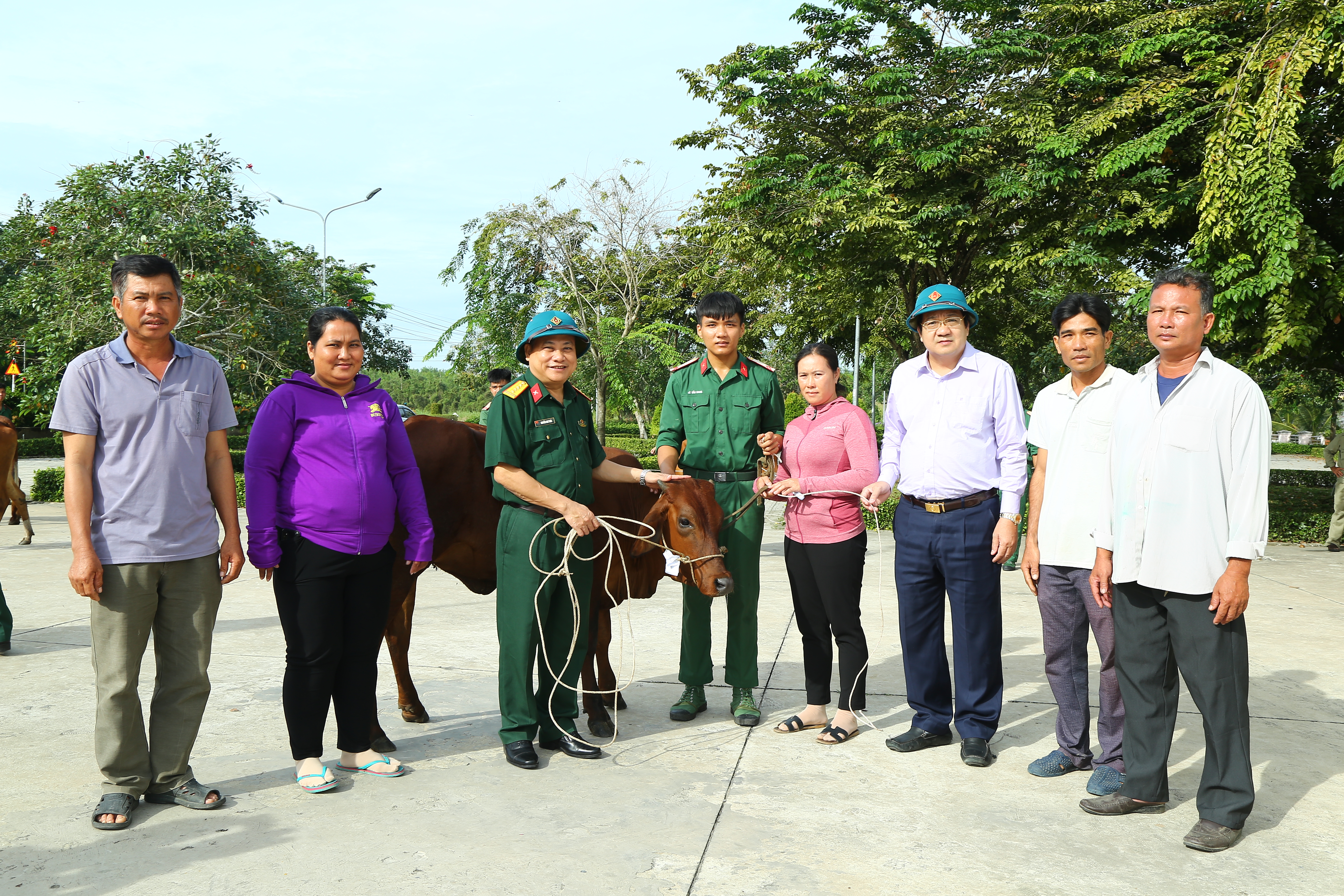 Đại tá Nguyễn Như Trúc, Phó Chủ nhiệm Chính trị Quân khu 7 trao tặng bò giống cho người dân lên định cư ở Điểm dân cư liền kề chốt dân cư biên giới.
