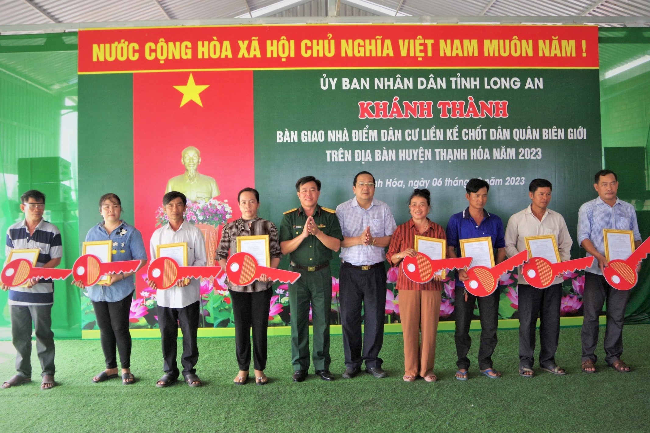 Đại tá Thái Thành Đức, Phó Chủ nhiệm Chính trị Quân khu 7 và đồng chí Nguyễn Minh Lâm, Phó Chủ tịch UBND tỉnh Long An trao chìa khóa tượng trưng cho các hộ dân tại Điểm dân cư liền kề chốt dân quân biên giới trên địa bàn huyện Thạnh Hóa, tỉnh Long An.