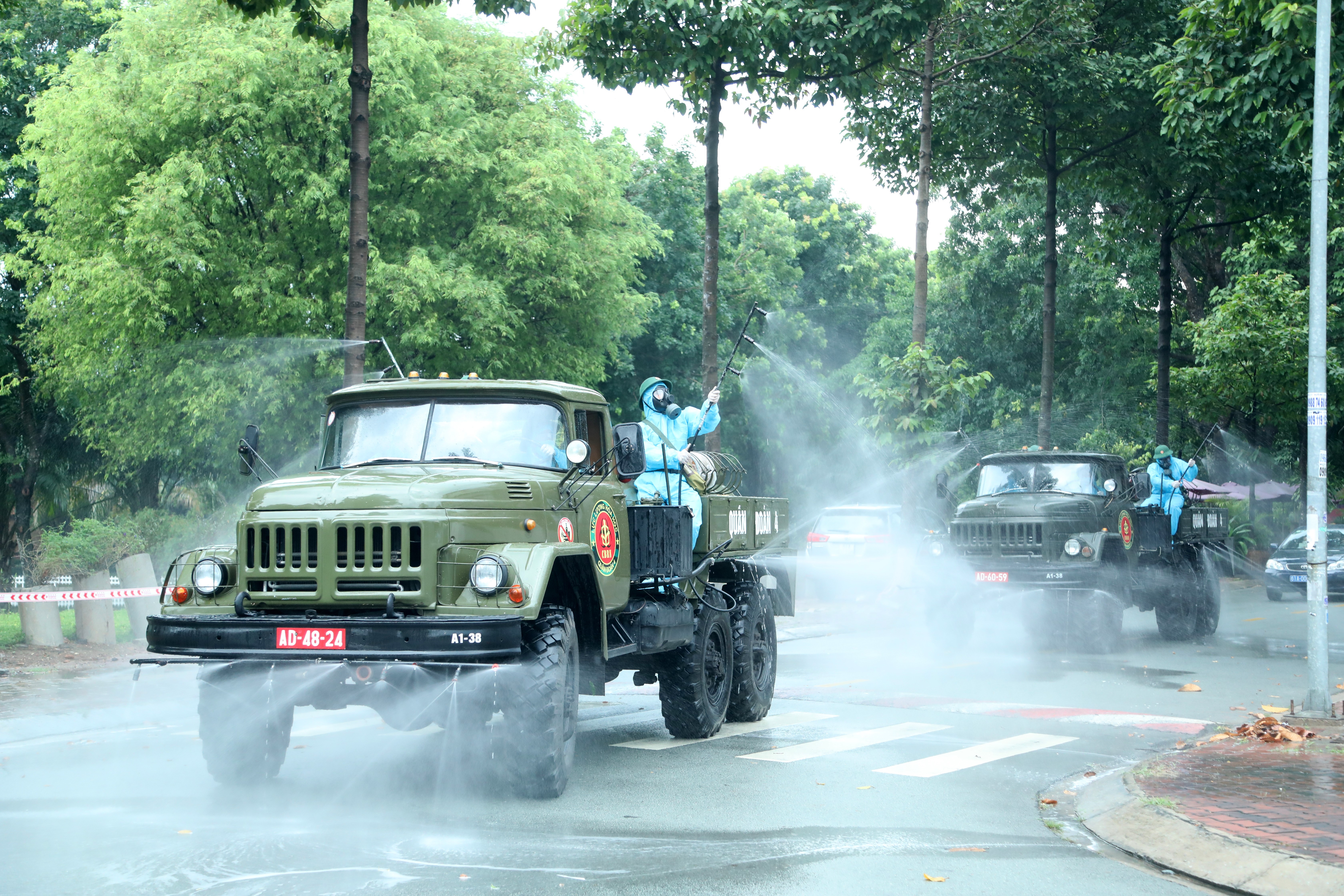Lực lượng Phòng hóa Quân đoàn 4 phun khử khuẩn tại TP Dĩ An, tỉnh Bình Dương.