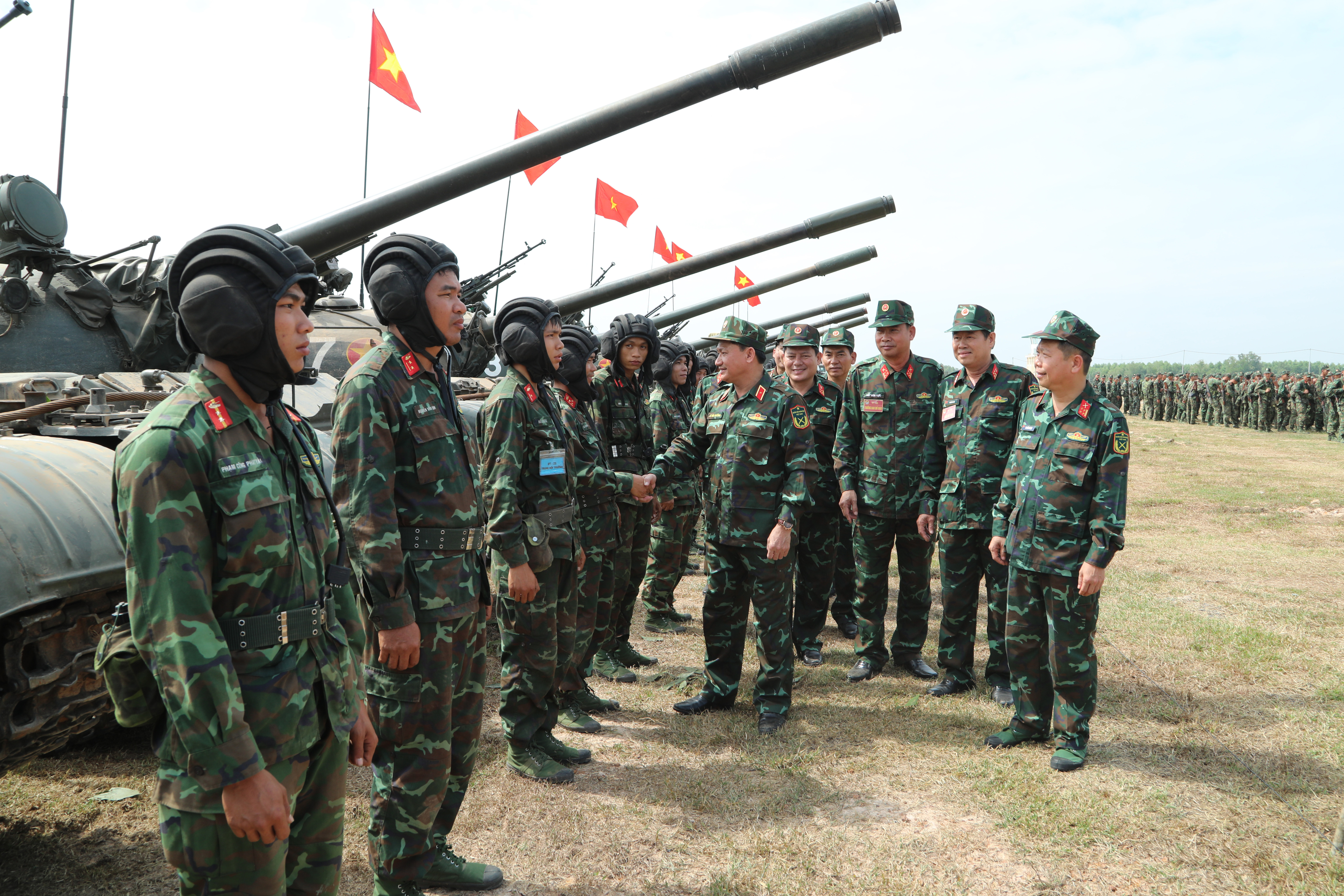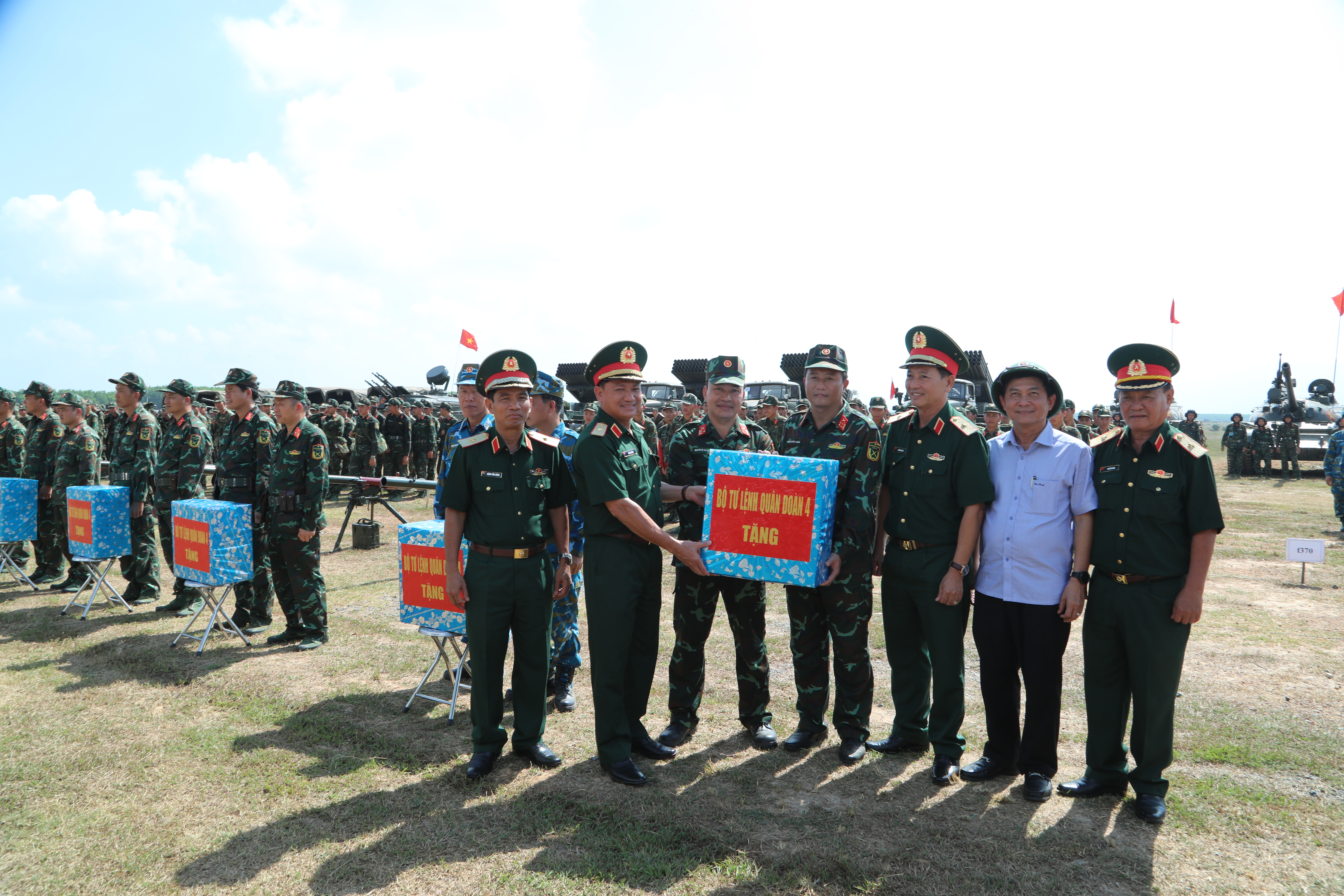 Thủ trưởng Bộ Tư lệnh Quân đoàn 4, Thủ trưởng Bộ Tư lệnh QK7, tỉnh Bình Dương động viên cán bộ, chiến sĩ Sư đoàn 9 hoàn thành nhiệm vụ diễn tập.