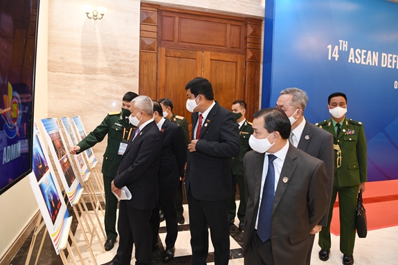 Đại sứ, Tùy viên Quốc phòng các nước ASEAN tại Việt Nam tham quan triển lãm ảnh bên lề Hội nghị ADMM-14 tại điểm cầu Hà Nội.