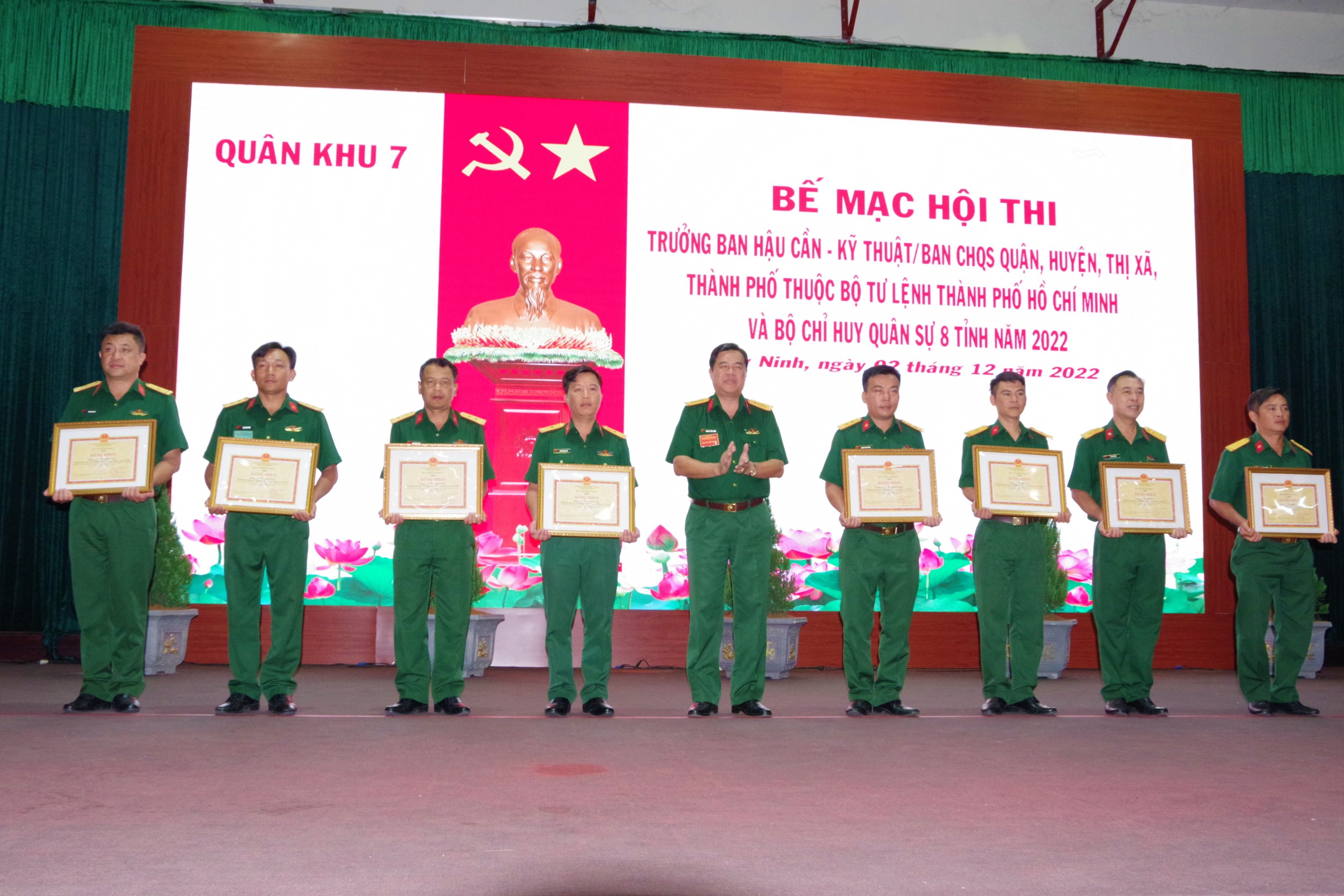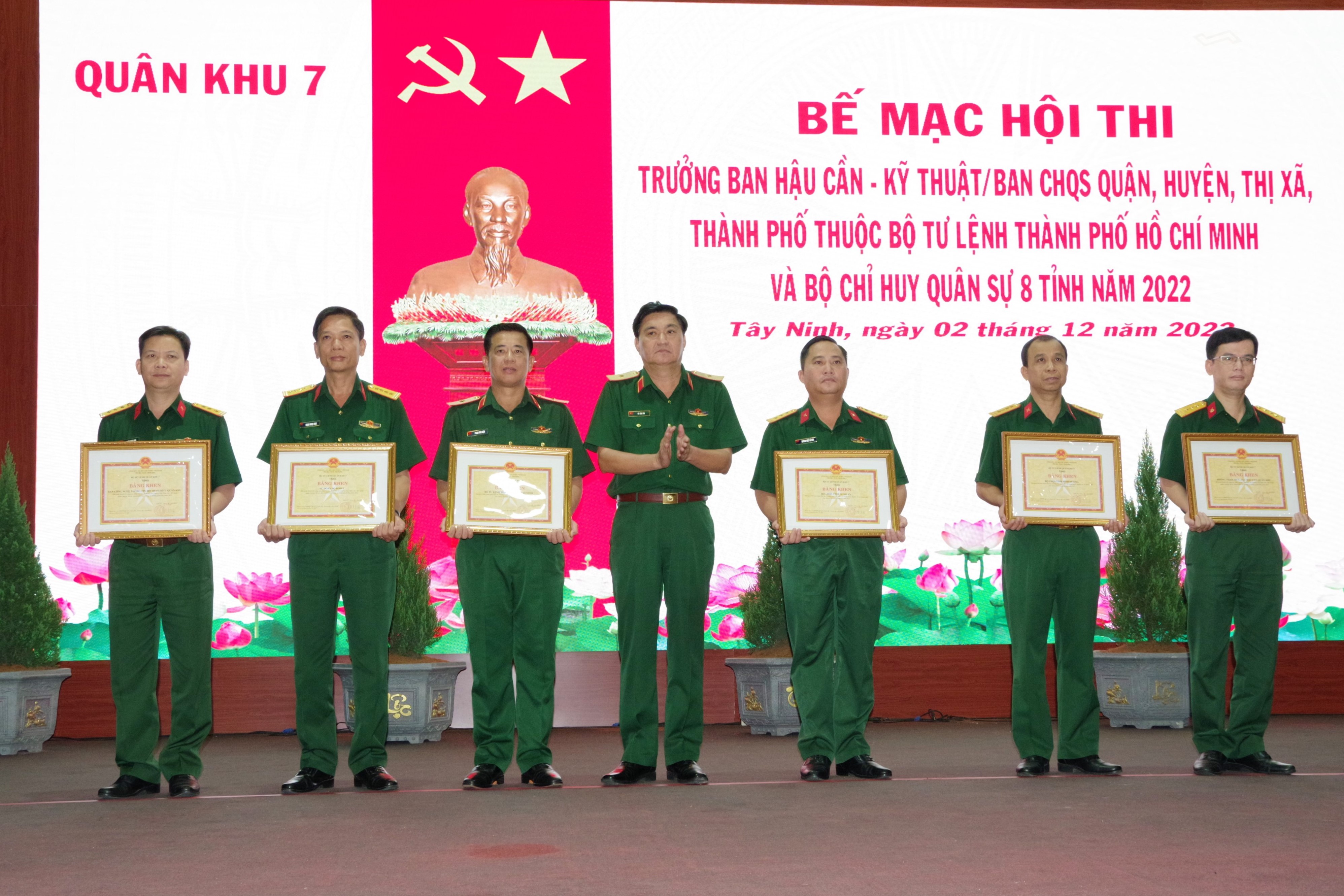 Thiếu tướng Võ Văn Thi, Phó Tư lệnh Quân khu 7 trao thưởng cho các tập thể và đơn vị bảo đảm cho hội thi thành công tốt đẹp.