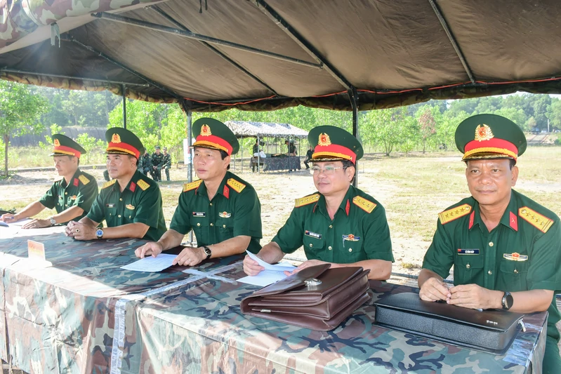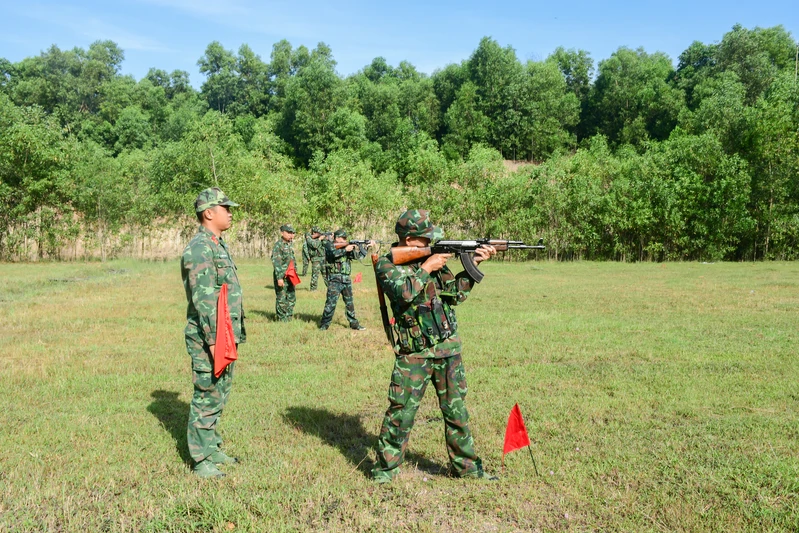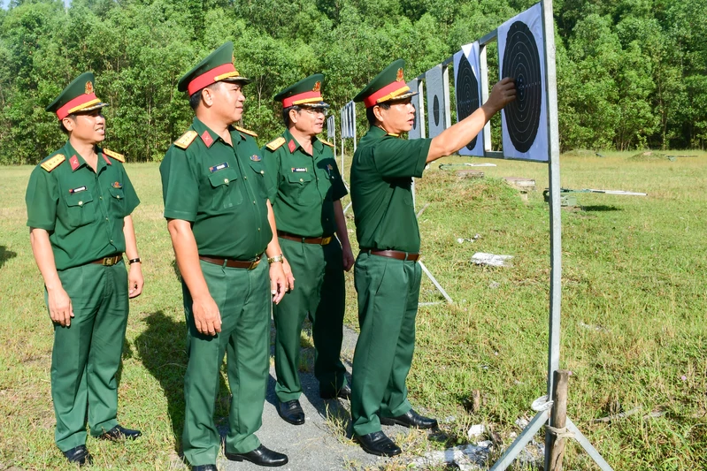 Đại tá Phùng Thế Hùng, Phó tham mưu trưởng Quân khu kiểm tra nội dung thực hành bắn súng ngắn K54 và súng tiểu liên AK.
