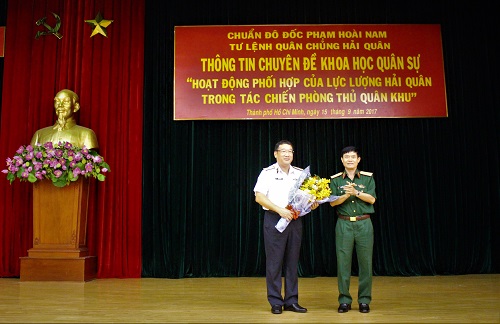 (QK7 Online) - Ngày 15/9, Quân khu 7 tổ chức hội nghị thông tin chuyên đề KHQS cho đội ngũ cán bộ chủ trì, lãnh đạo, chỉ huy các cơ quan, địa phương và đơn vị thuộc Quân khu 7 về "Hoạt động phối hợp của lực lượng Hải quân với Quân khu 7 trong tác chiến phòng thủ quân khu". Chuyên đề do Chuẩn đô đốc Phạm Hoài Nam - Uỷ viên Trung ương Đảng, Tư lệnh Quân chủng Hải Quân trình bày.