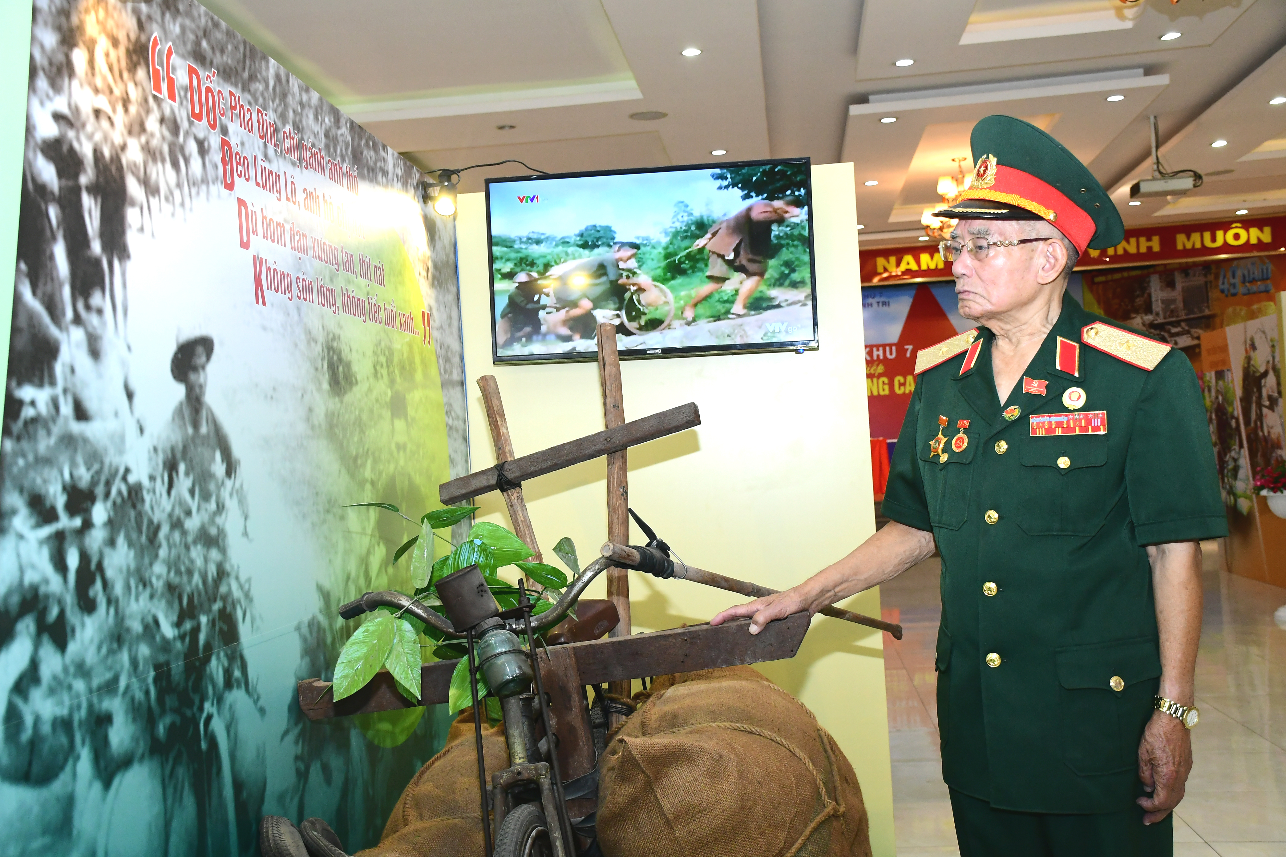 Trung tướng Nguyễn Trường Thắng và các đại biểu tham quan hình ảnh xe đạp thồ trong chiến dịch Điện Biên Phủ.