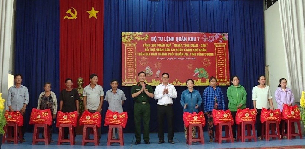 (QK7 Online) - Nhân dịp tết Nguyên đán Giáp Thìn 2024, ngày 30-1, thừa ủy quyền của Bộ Tư lệnh Quân khu, Bộ Chỉ huy Quân sự tỉnh Bình Dương tổ chức trao quà “Nghĩa tình quân - dân” cho các gia đình chính sách, người dân có hoàn cảnh khó khăn và công nhân thất nghiệp trên địa bàn tỉnh.