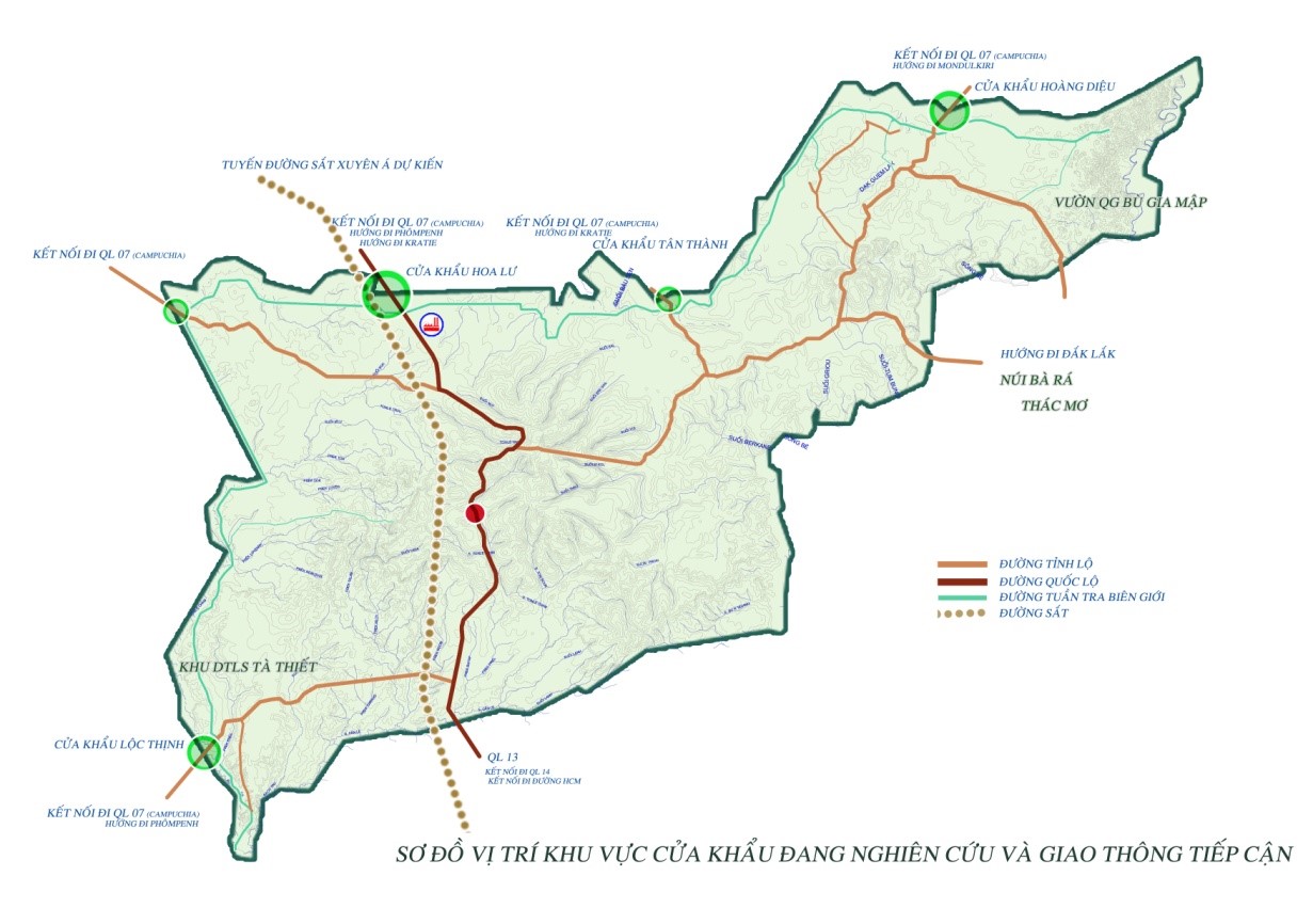 Các cửa khẩu chính: Cửa khẩu quốc tế Hoa Lư, cửa khẩu quốc gia Hoàng Diệu, Lộc Thịnh, cùng cửa khẩu phụ Tân Tiến.
